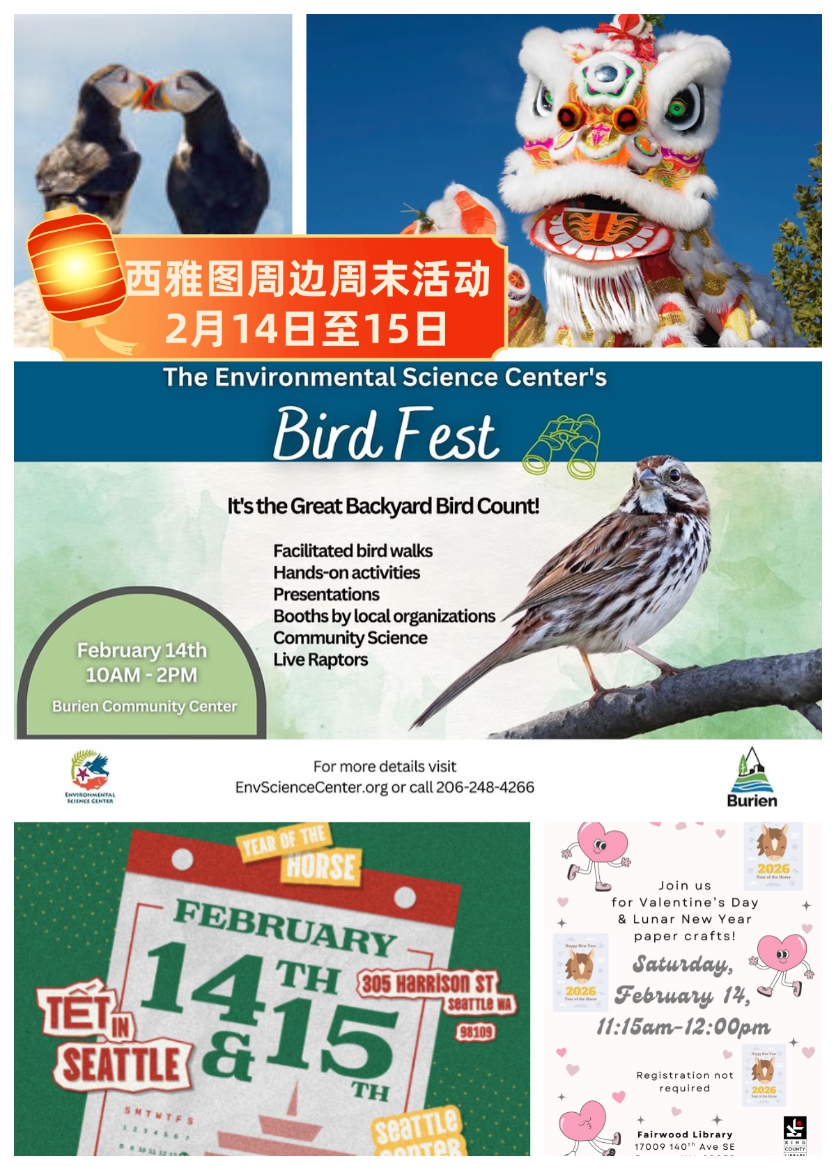 本周末西雅图中文电台筹备已久的华人春晚即将开演,目前仍有少量余票,千万不要错过。除了年味浓浓的演出,我们还特别挑选了东区暑期夏令营特惠、冬奥主题活动、户外老鹰节和亲子木工坊,愿您能有个难忘的周末。