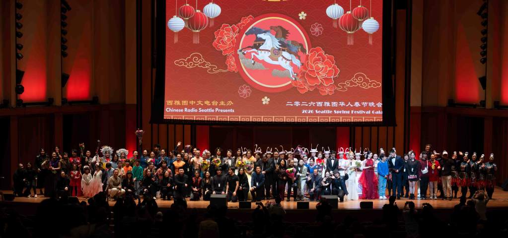 2026年2月8日晚,由西雅图中文电台主办,宛儒艺术中心、4Culture、ArtsFund协办的2026年西雅图华人春晚,为大西雅图地区华人社区带来“双喜临门”的难忘夜晚。晚会群星璀璨,阵容豪华。中国著名魔术艺术家孙峥、中国国际一级杂技演员赵春立与李佳夫妇、邓丽君文教基金会认定的“小邓丽君”张瀞云、CCTV《星光大道》知名少年歌手王泓翔、亚洲创造营学员李诗恬、宝丽金签约歌手王佩,以及来自西雅图的蒙古姐弟乐队ZJE,与大西雅图地区十多个演出团体和个人,共计300余名演员登台献艺。整场演出阵容多元、风格交融,既有世界级艺术家的专业呈现,也有本地新秀的青春风采,充分展现了华人文化在海外的活力与传承。