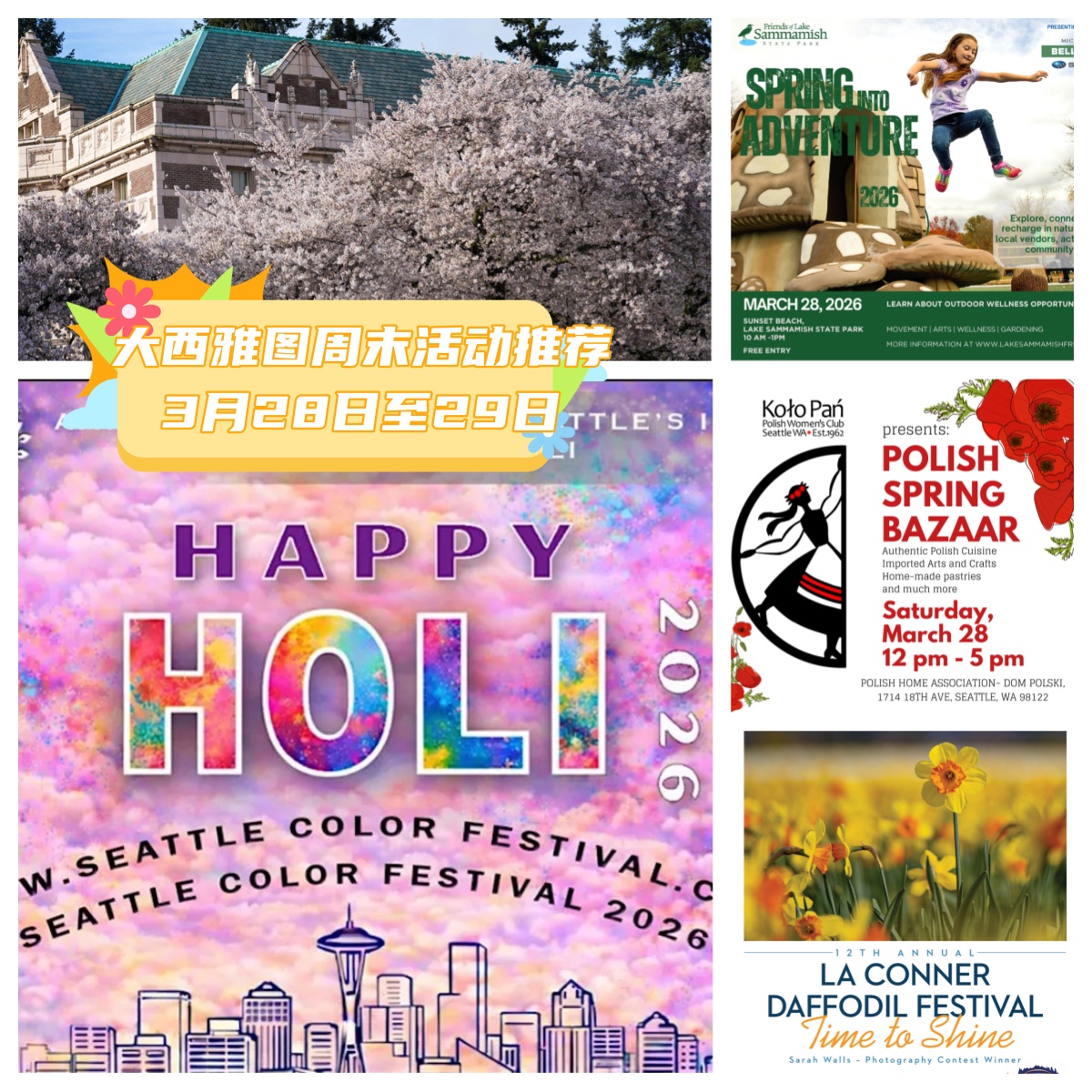 这个周末活动多元且精彩!室外,在Sammamish湖滨尝试一场绿色探险,或去赏樱花、赏郁金香;室内,在洒红节活动中感受印度文化,或去波兰集市品尝正宗波兰美食。