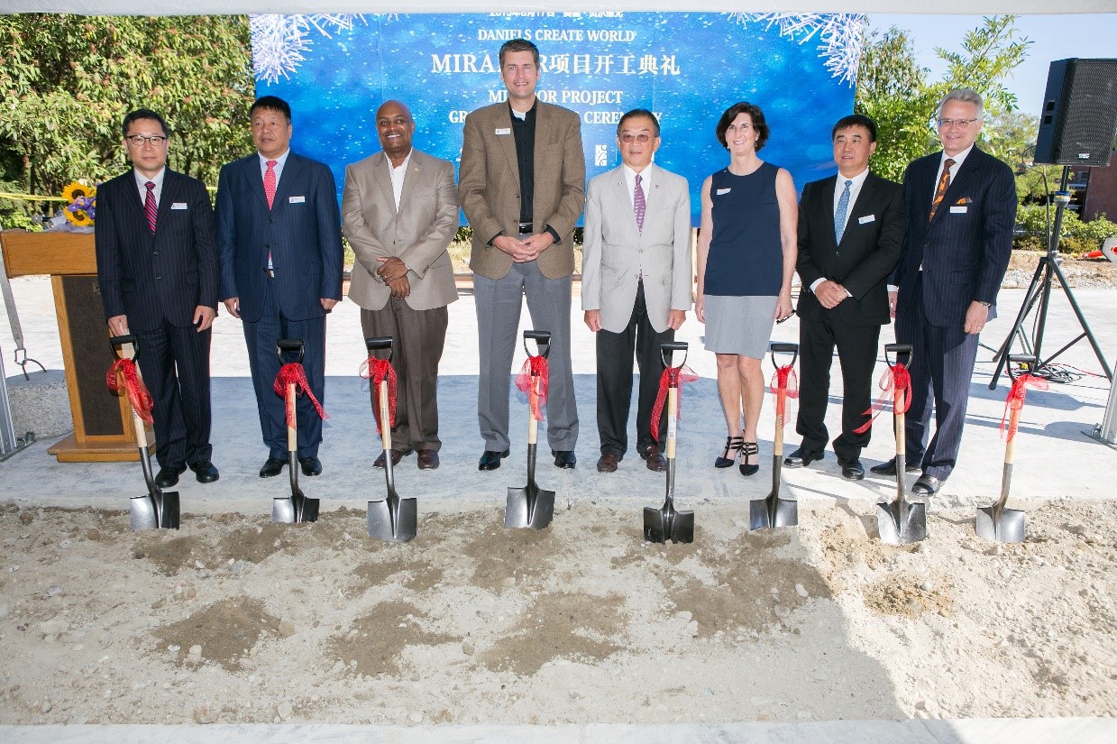 (项目方团队奠基照片。左起拓宏美国公司CEO 吕莉莉,拓宏董事长杨宏鹏,拓宏Kevin Daniels,施工方Scott Stevenson,Chinn施工团队董事长Kevin Chinn,Lewis副董事长Jeff Cleator,GGLO董事长Jeff Foster)