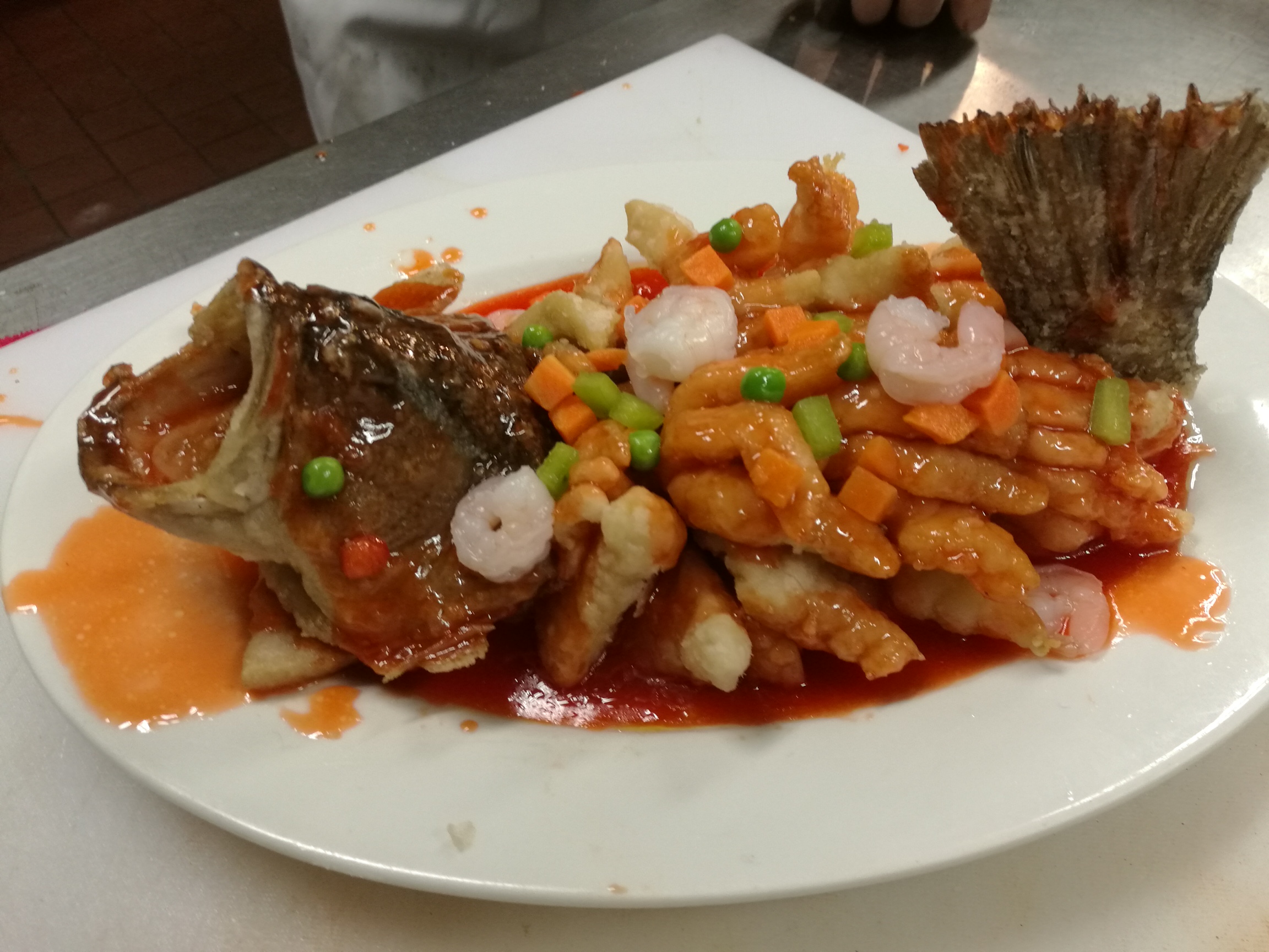 为让松鼠鳜鱼“游”到西雅图,苏帮大厨做了大量功课。据钟慎明介绍,西雅图市场没有鳜鱼,他们经过比对尝试,选择当地鲈鱼为原料。按照苏帮松鼠鳜鱼传统做法,鳜鱼规格在750克到1000克左右,然而西雅图鲈鱼“个头”较小,一般是500克左右。为让美国顾客品尝到苏帮“标准规格”松鼠鱼,苏帮大厨另取一段鲈鱼肉段,“开刀”成型后,接在松鼠鲈鱼鱼头后,形成一盘“一条半”的规格,不仅规格到位,形状也更好看。