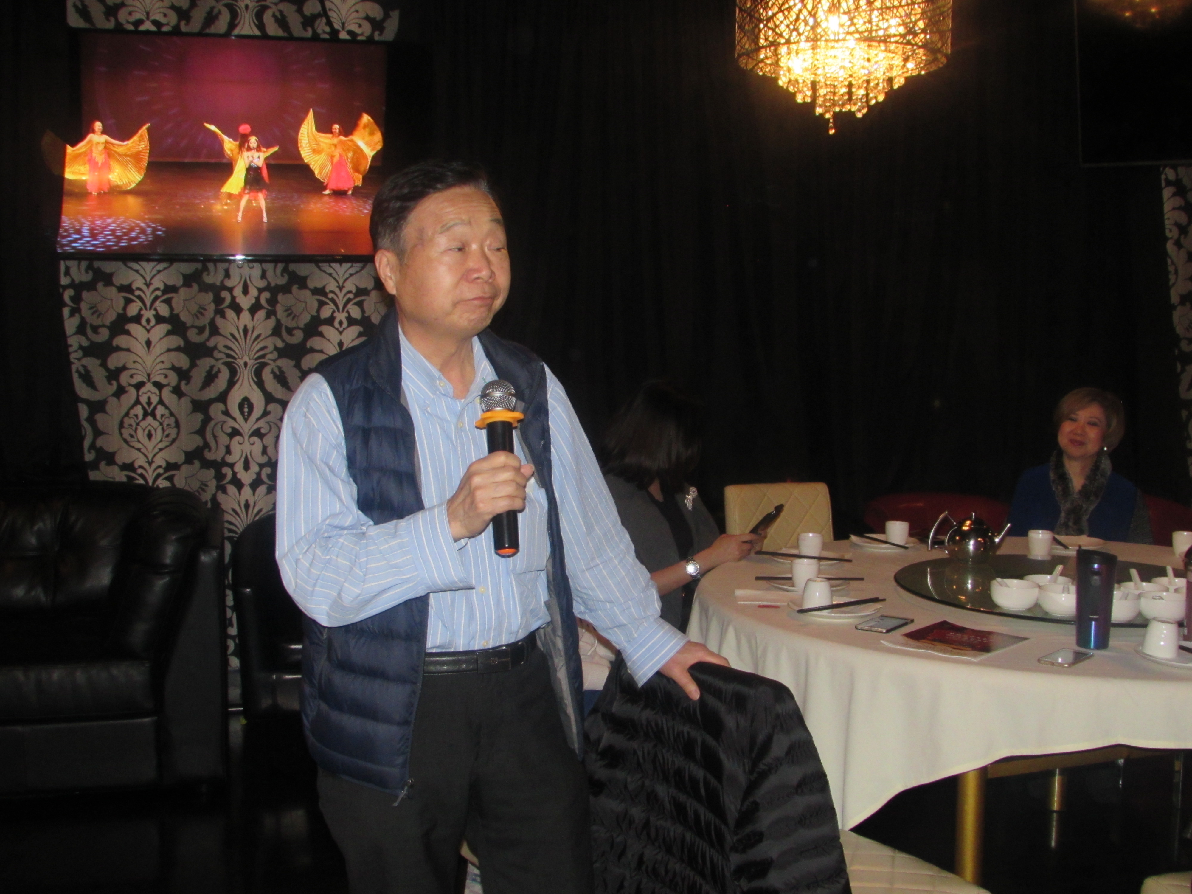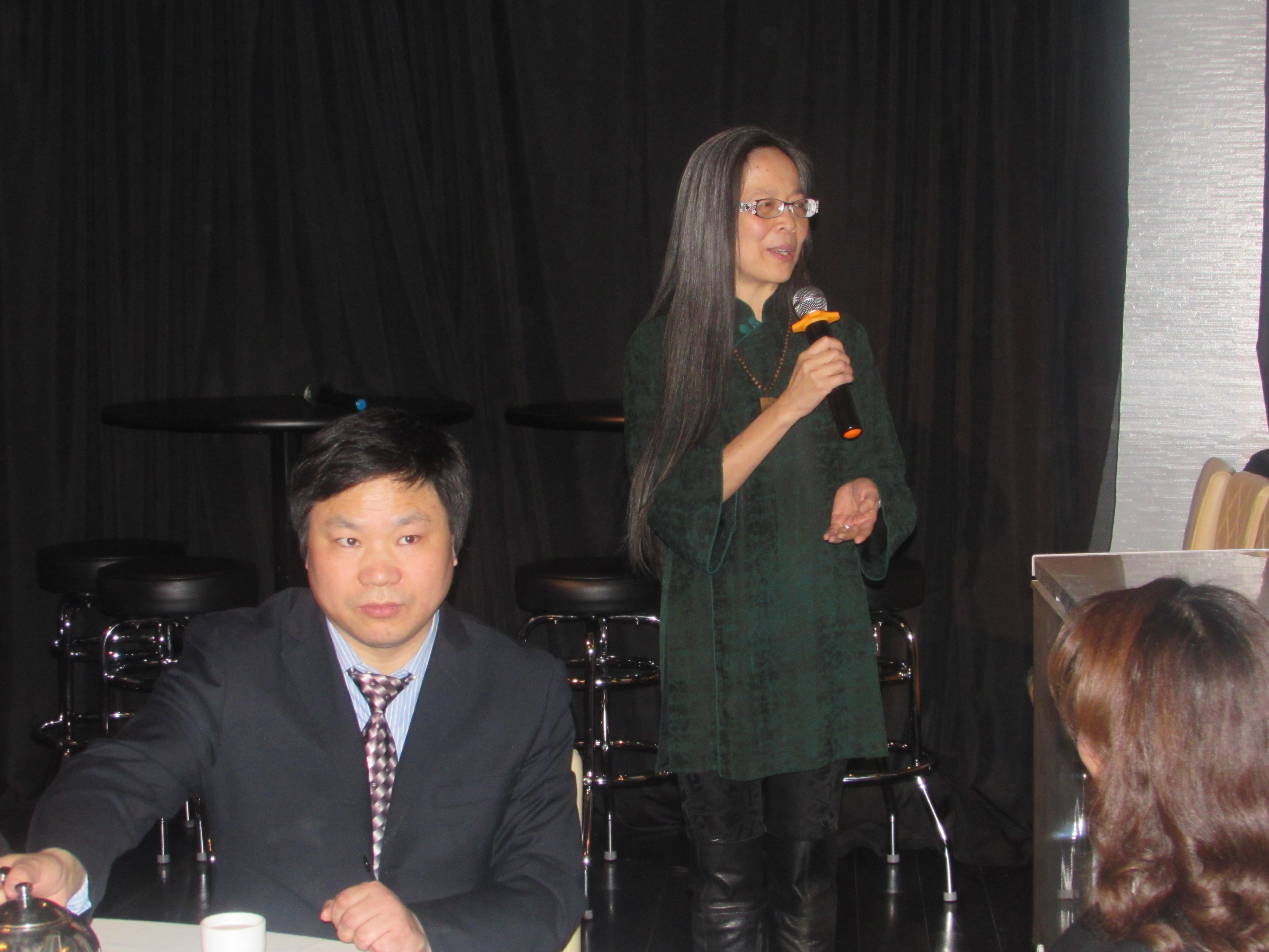 (西雅图中文电台台长苏小元在庆功会上发言)