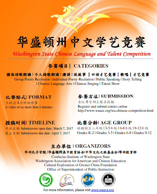 华州中文学艺竞赛已连续举办多年,是华州规模最大的中小学生中文学艺竞赛,每年报名参加的学生非常踊跃。今年的竞赛由华盛顿州美中教育协会(WAACE),华盛顿州孔子学院(CIWA)、中华文化之旅基金会(CE)、华州教育部世界语言组(OSPI-WL)四个组织联合主办,由西雅图中文电台等协办。