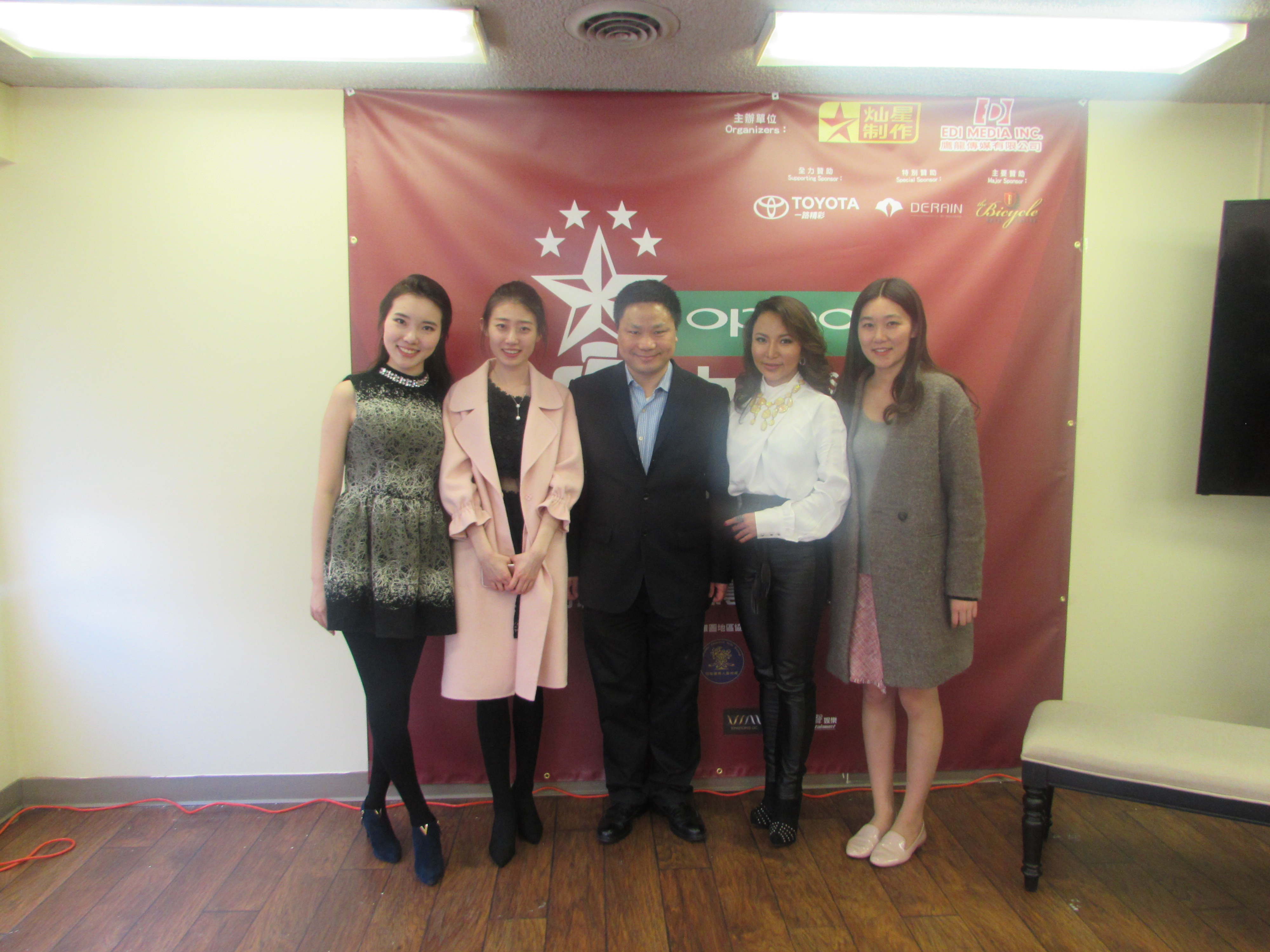 (左起:中国新歌声西雅图赛区海选主持人思墨、晓琪,西雅图中文电台台长小元,海选评委邵燕妮,海选工作人员Jennifer Yang)
