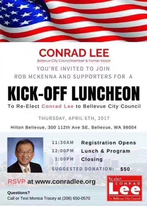 从政担任Bellevue市议员23年的、并曾担任市长的李瑞麟(Conrad Lee)即将竞选第七任市议员。李市长是大西雅图地区首位华人市长,也是首位少数族裔的市长,他是我们大西雅图地区华人的骄傲,而大西雅图地区很多的华人活动,以及生活、发展等诸多方便,都得到了李市长的关心和支持。如果4月6日中午你有空,欢迎参加李瑞麟市长的竞选开启午餐会