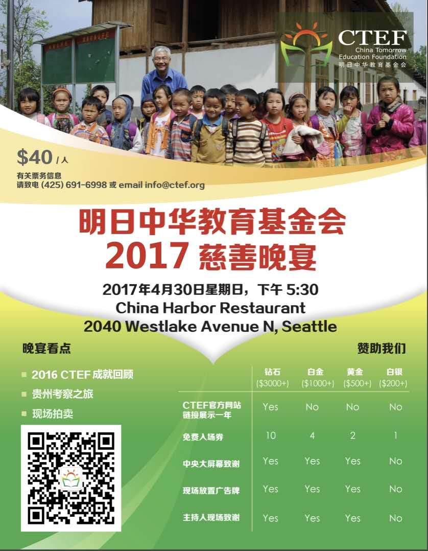 在新的一年里,CTEF不仅要举办多个为“明日中华之教育”筹集资金的活动,也要在中国一如既往地将百分之百的捐款用到边远省份的学校和孩子们身上。2017年4月30日,CTEF将在海景大酒楼举办年度晚会,同时为中国的孩子们筹款,欢迎您的参加。