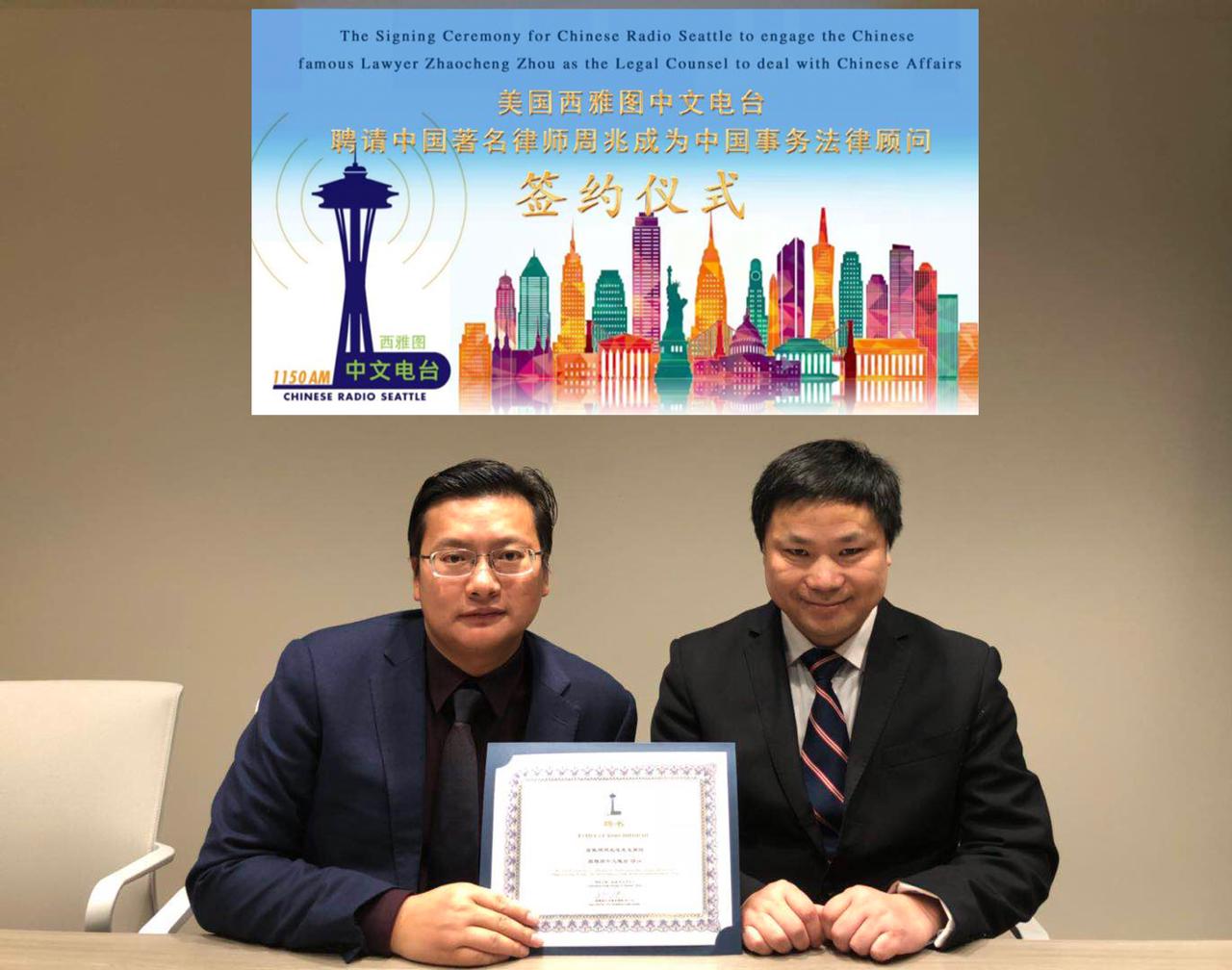 【西雅图中文电台报道】北京著名律师周兆成2018年1月3日受聘为美国西雅图中文电台中国事务法律顾问,成为这家美国知名中文电台的第22位顾问。该电台现任顾问还包括微软公司执行副总裁沈向洋、亚马逊公司副总裁李南燕、美国贝尔维优市前市长、现任市议员李瑞麟、中央电视台影视剧制作中心导演谢晓嵋等。华州参议员长谷川(Bob Hasegawa)、华州广州同乡会创会会长、西雅图中文电台顾问梁国尧,以及华州广州同乡会会长、西雅图中文电台嘉宾萧鸣、西雅图中文电台嘉宾区伟明、彭秋风、孙荣、陈求昌、Vickie Gan,以及西雅图中文电台主持人汪忆华等参加了受聘仪式。