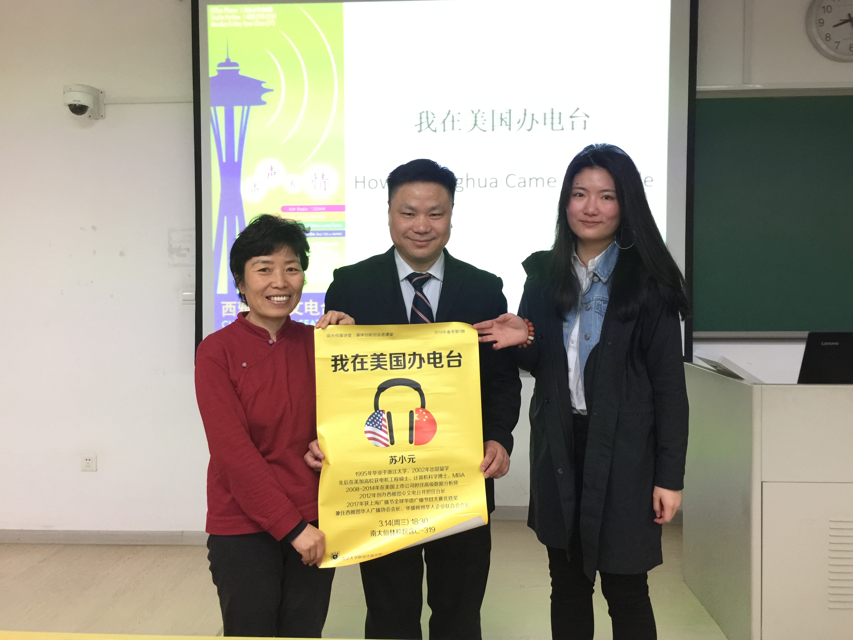 西雅图中文电台台长苏小元在今年3月8日到21日回到中国期间,先后在南京大学、西交利物浦大学、以及江苏省木渎中学举行演讲,分别介绍他在美国学习、生活、工作、创业经历,以及创办西雅图中文电台和担任台长的经历,受到热烈欢迎。