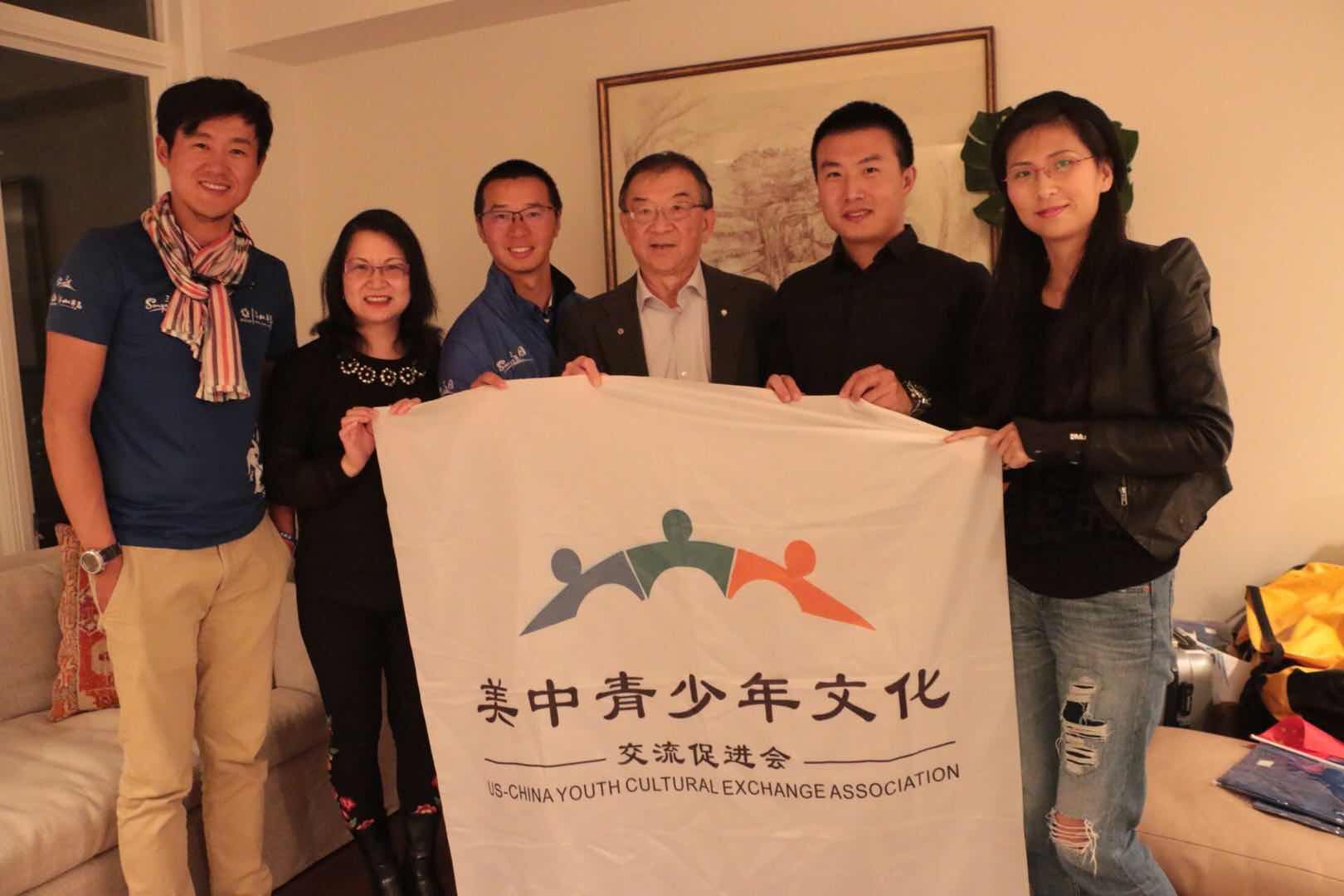(活动组织者西雅图美中青少年文化交流促进会周亮(右一)、孙丽(左一)与克利伯环球帆船赛创始人罗宾爵士合影)