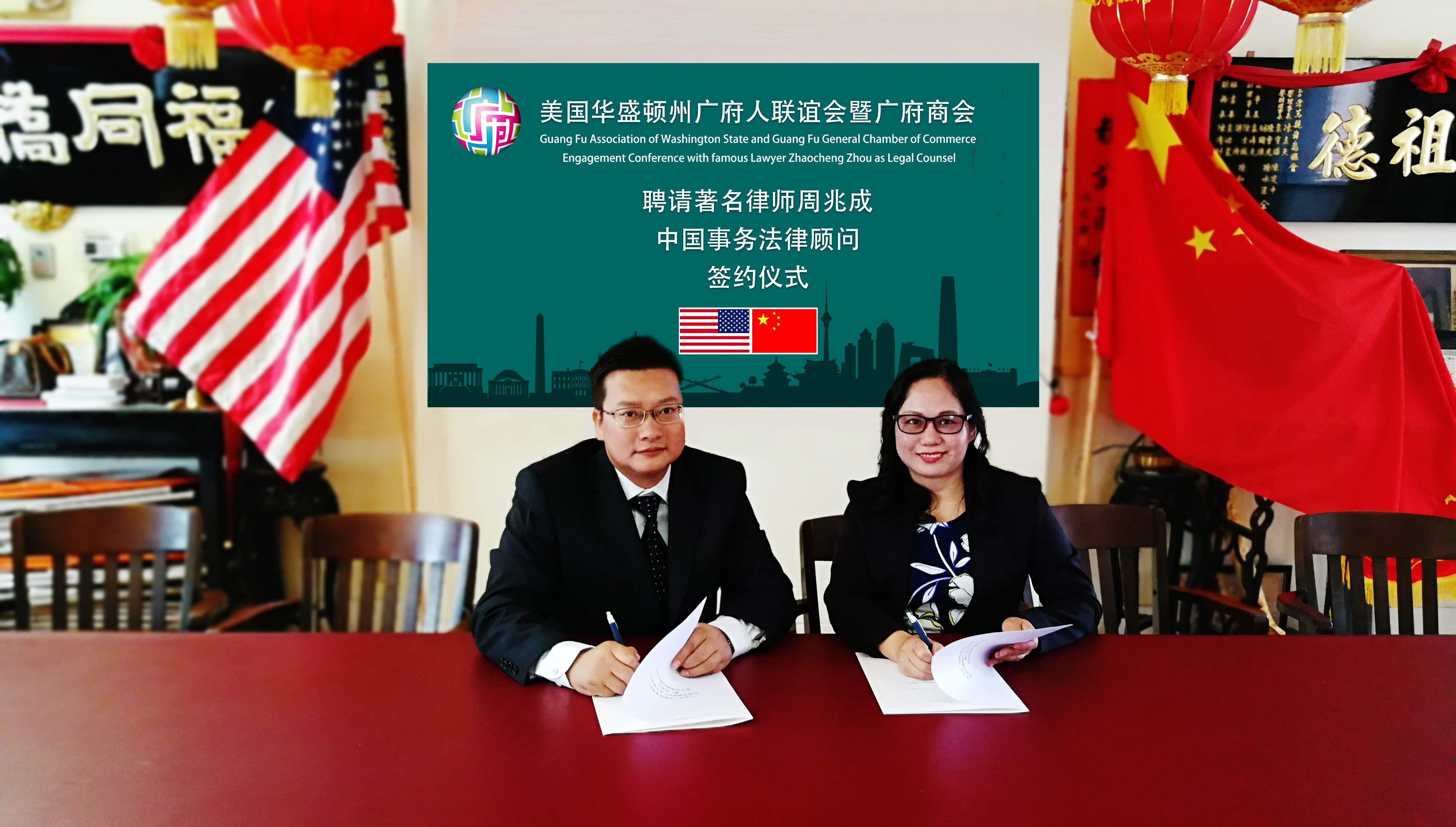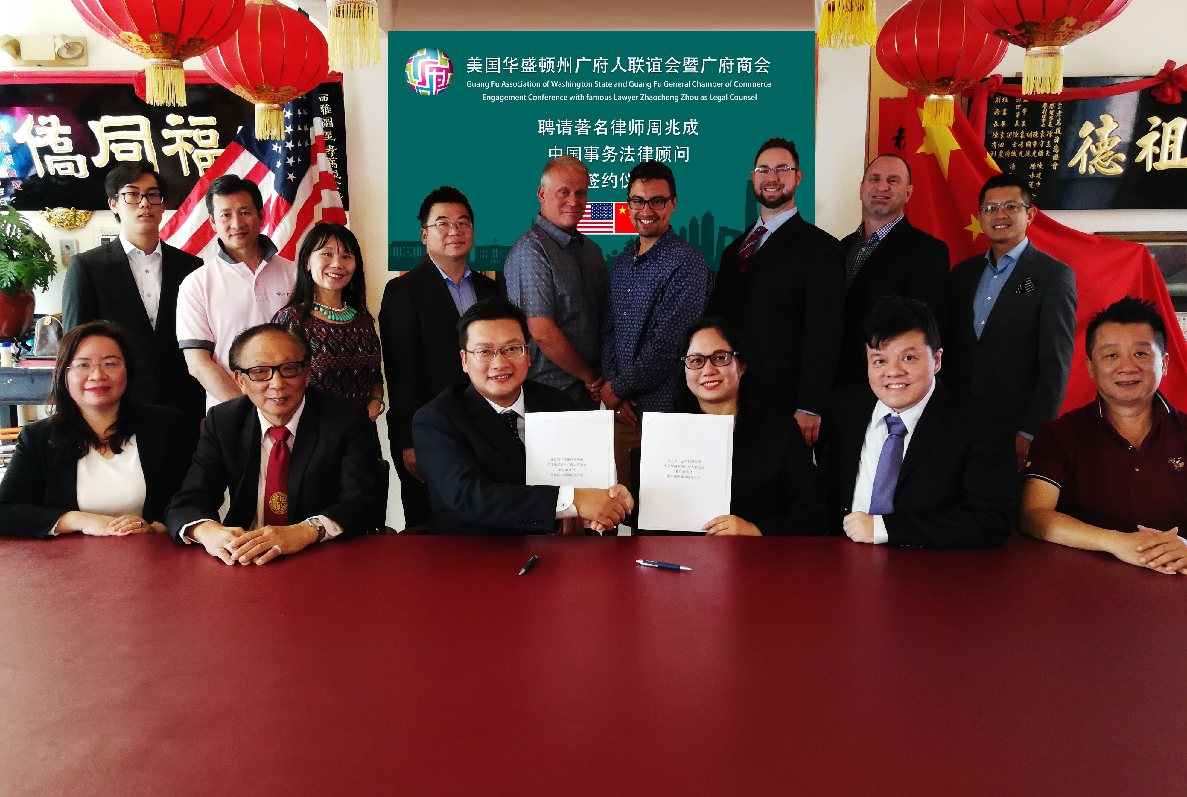 在签约仪式上,会长梁诗晴女士代表美国华盛顿州广府人联谊会暨广府商会与周兆成律师签约,美国华盛顿州广府人联谊会暨广府商会创会会长梁国尧先生,美洲至孝笃亲总公所元老陈求昌先生,美国联邦政府顾问白瑞德•博福特先生以及美国华盛顿州广州同乡联谊会会长萧鸣女士作为特邀嘉宾见证签约仪式;执行会长肖峰,理事长禤伟雄,副理事长杰西•梅耶、瑞伯•琼斯,理事何海峰、肖恩•乔斯坦、黃益文,宣传秘书长孙荣芬,秘书钟国斌、黄宇龙等出席签约活动;美国华盛顿州第十五届副州长布拉德·欧文先生、华州参议员鲍勃·长谷川先生、华州众议员葛素玲女士以及美洲至孝笃亲总公所好友会会长区伟明(Tony Au)为此次签约仪式发来祝贺。