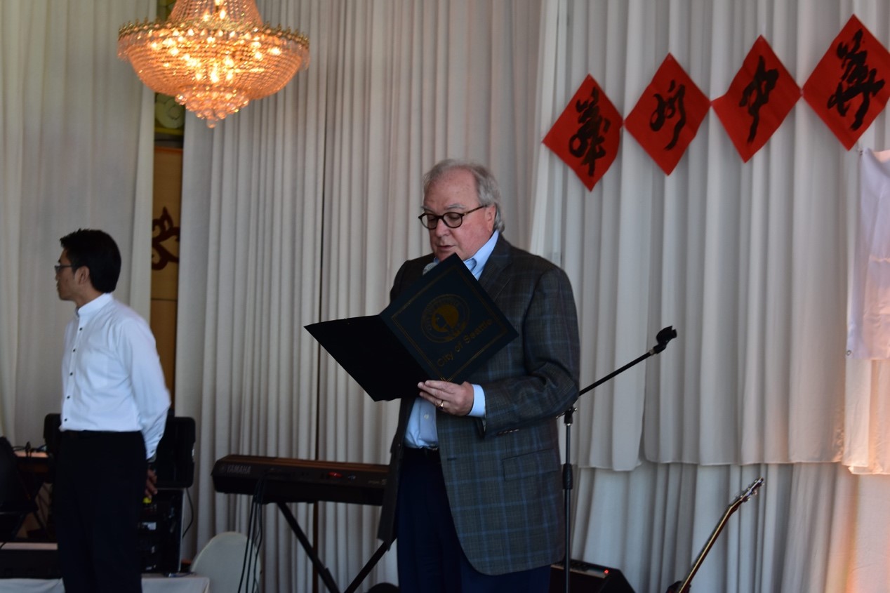 (西雅图副市长大卫.莫斯利代表市政府宣读贺词)