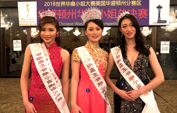(2018年华盛顿州华裔小姐冠军施柯亦(中),亚军黄施蔓(左一),季军赵卓君(右一))