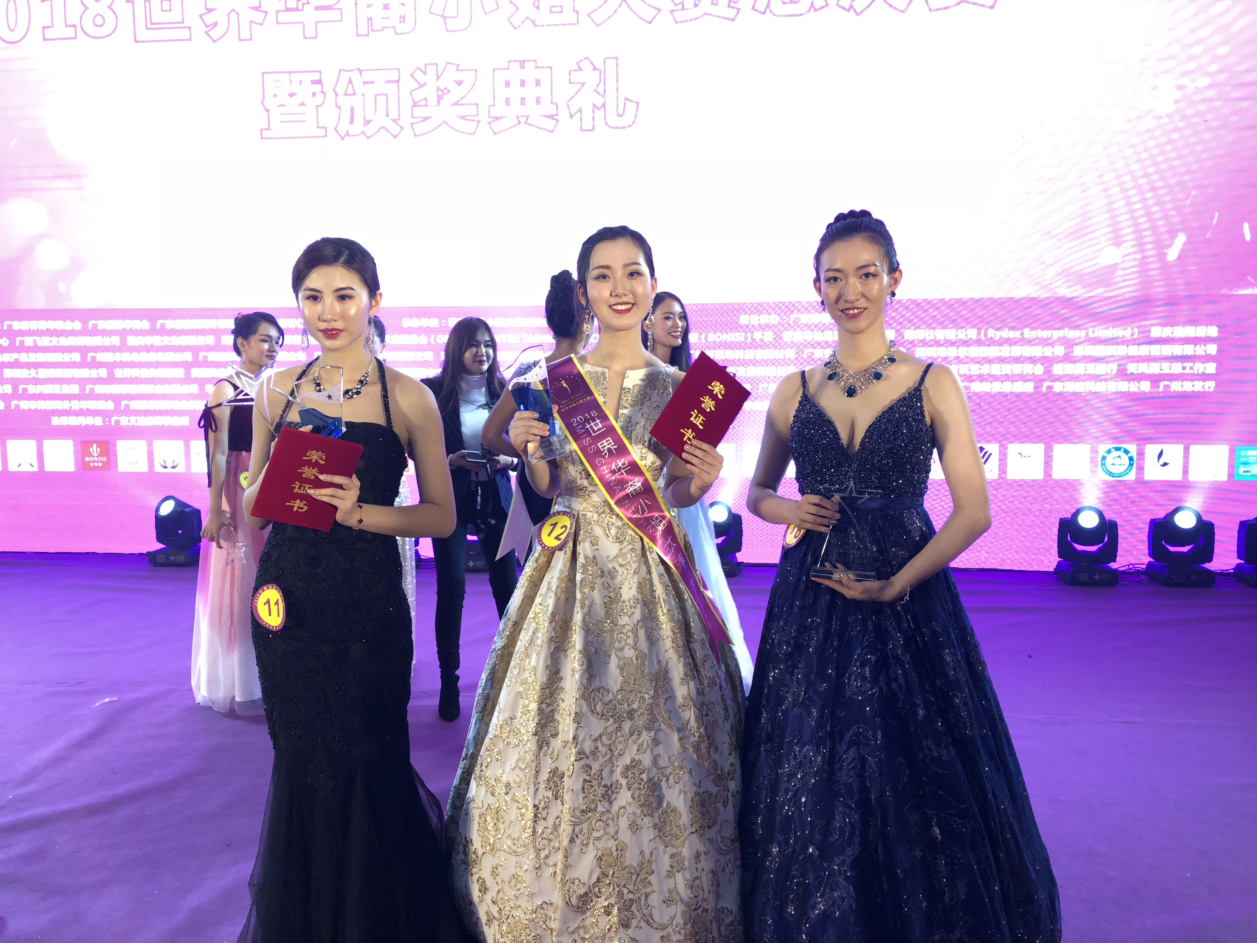 (来自西雅图的选手黄施蔓(左)、施柯亦(中)、赵卓君(右)在世界华裔小姐大赛的舞台上)