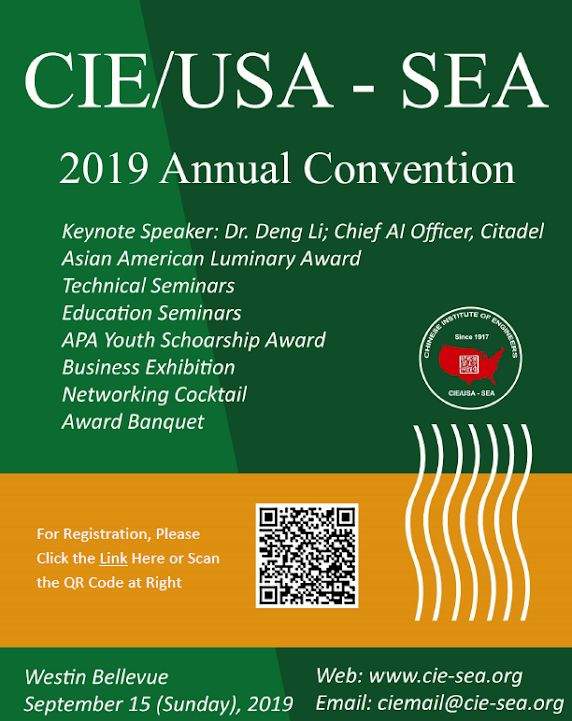 2019美洲中国工程师学会西雅图分会的年会将于9月15日星期天在Westin Bellevue召开。年会期间将隆重举办论坛活动及颁奖典礼。年会从下午1:00到晚上9:30,欢迎在cie-sea.org网站上报名。