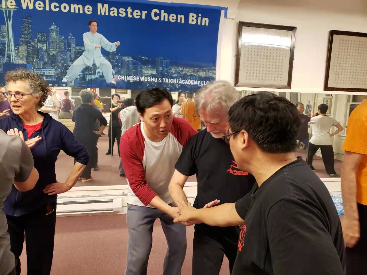抵达当天陈斌老师携夫人王娴娴女士与洪一姣老师,世界日报、西华报、西雅图中文电台等当地媒体的负责人,及华盛顿大学图书馆负责人、华盛顿州孔子学院院长等一同共进午宴,进行了亲切友好的交流。14日下午,陈斌老师不顾旅途的劳累,开始为70多位当地拳友教授太极缠丝功的技法和要领。现场氛围热烈,洪一姣老师在朋友圈中这样写道:陈斌大师兄弟,两小时缠丝功课程全程英文,文词要点准确流畅清晰,七十名美国学员聚精会神,一刻也不愿休息。I am really pround of Master Chen Bin!