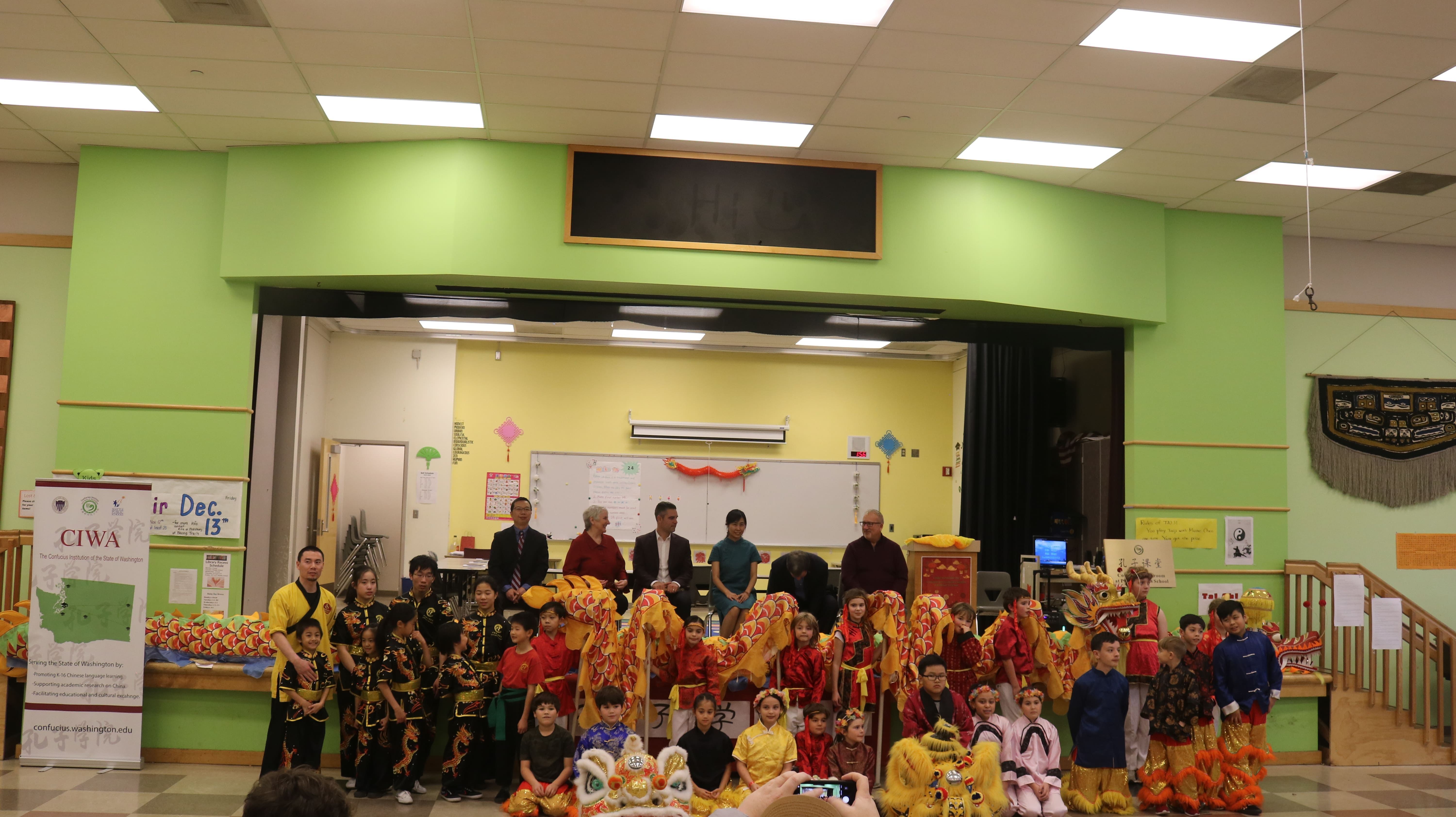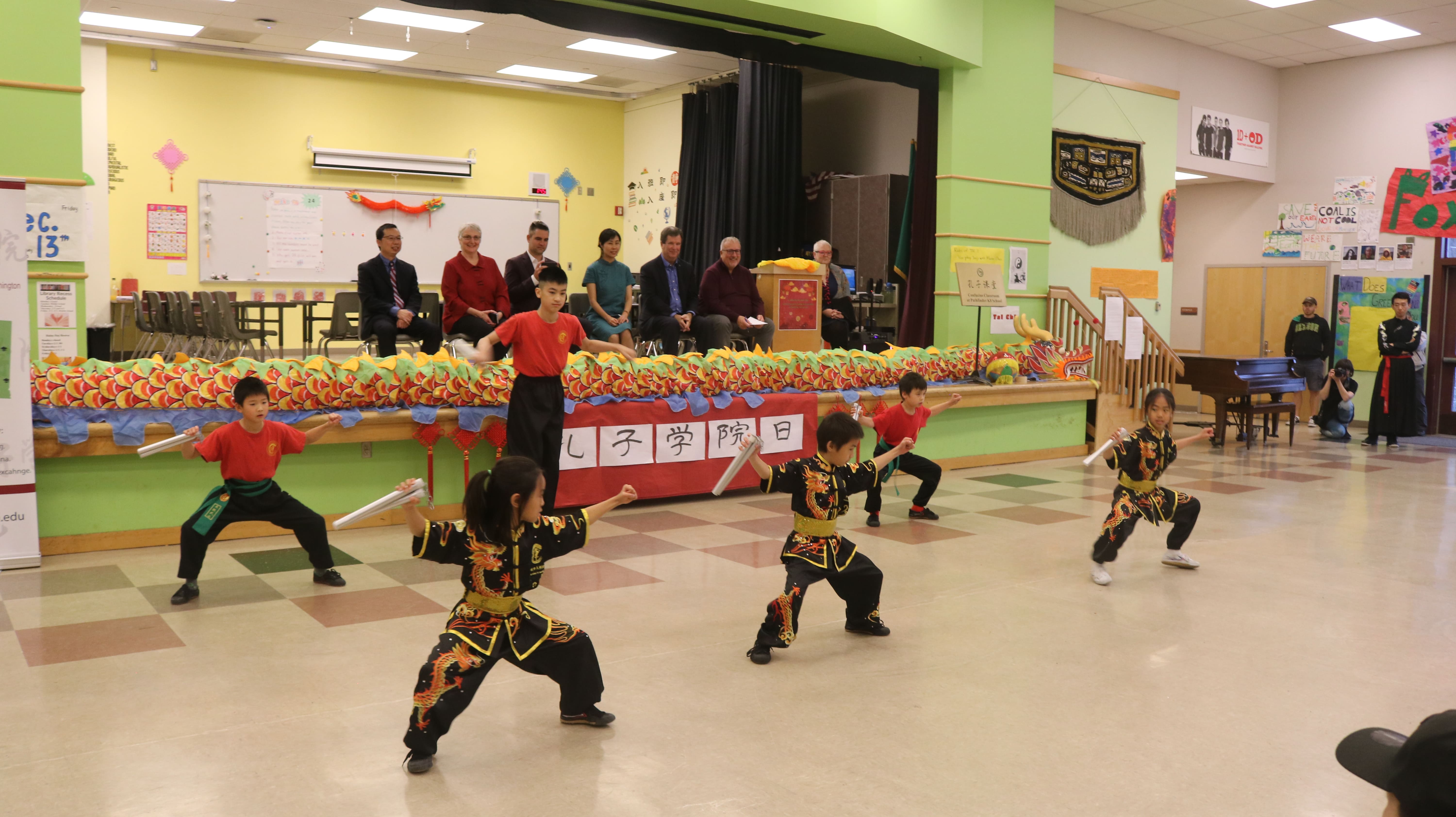 11月16日下午,华盛顿州孔子学院在Pathfinder K-8学校举办2019孔子学院日暨Pathfinder K-8学校孔子课堂揭幕仪式,华州孔子学院美方院长、华盛顿大学全球事务副教务长Jeffrey Riedinger博士、Pathfinder K-8学校校长David Dockendorf、华州孔子学院中方院长邓波、华州孔子学院中方院长黄东梅等出席“孔子学院日”活动。Dockendorf校长以及Riedinger院长等先后致辞,并与黄东梅院长等为位于Pathfinder K-8学校的”孔子课堂“揭幕。活动现场还举行了舞龙、舞狮、少林功夫、太极拳、书法等的表演。