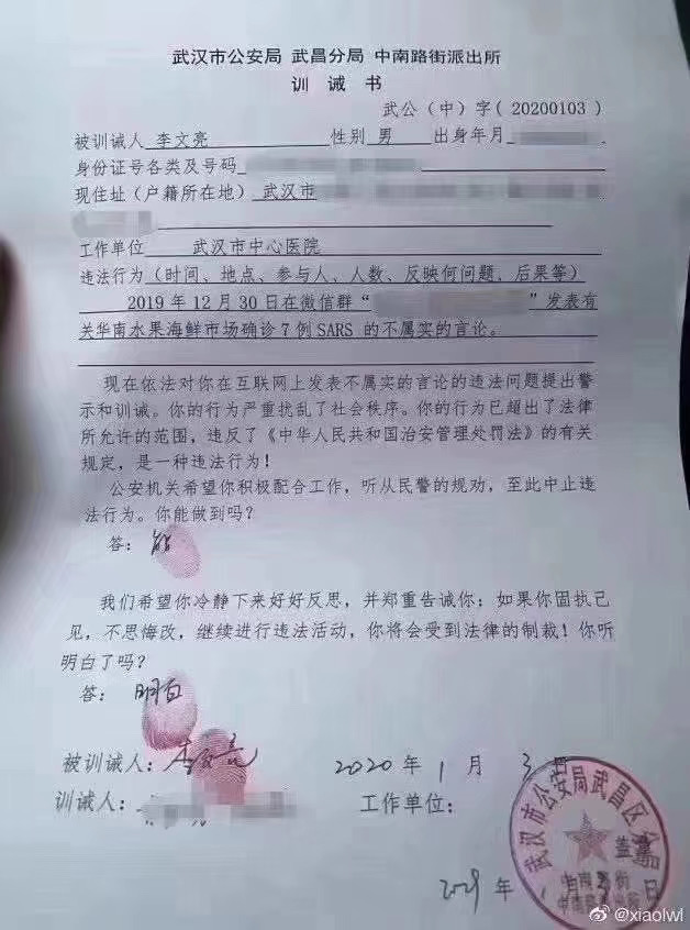 但不久后,他就被当地派出所因“在互联网发布不实评论”,提出警示,批评。公安局找到他,要求他签了训诫书,纠正他提出严厉警告,训诫他如果不听从劝告和悔改,继续进行武装违法活动,将会受到法律制裁。武汉警方发布公告称:一些网民在不经核实的情况下,在网络上发布,转发不实信息,造成不良社会影响。公安机关经调查核实,已传唤8名违法人员,并依法进行处理。李文亮就是这8名“违法人员”之一。签署了训诫书之后的李文亮继续留在医院工作。而此时此刻的武汉当局也试图阻止有人“造谣传谣”,稳定人心。