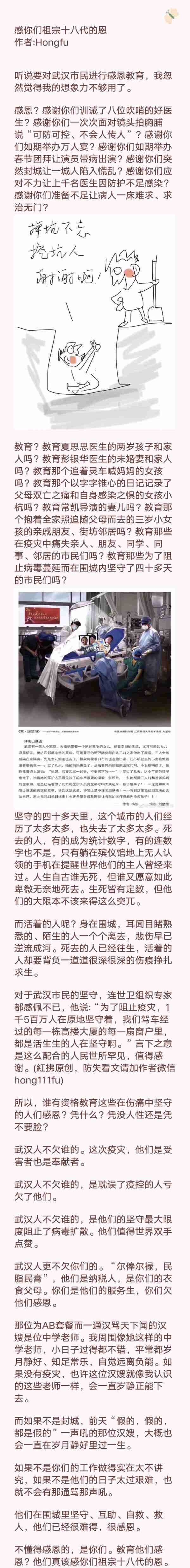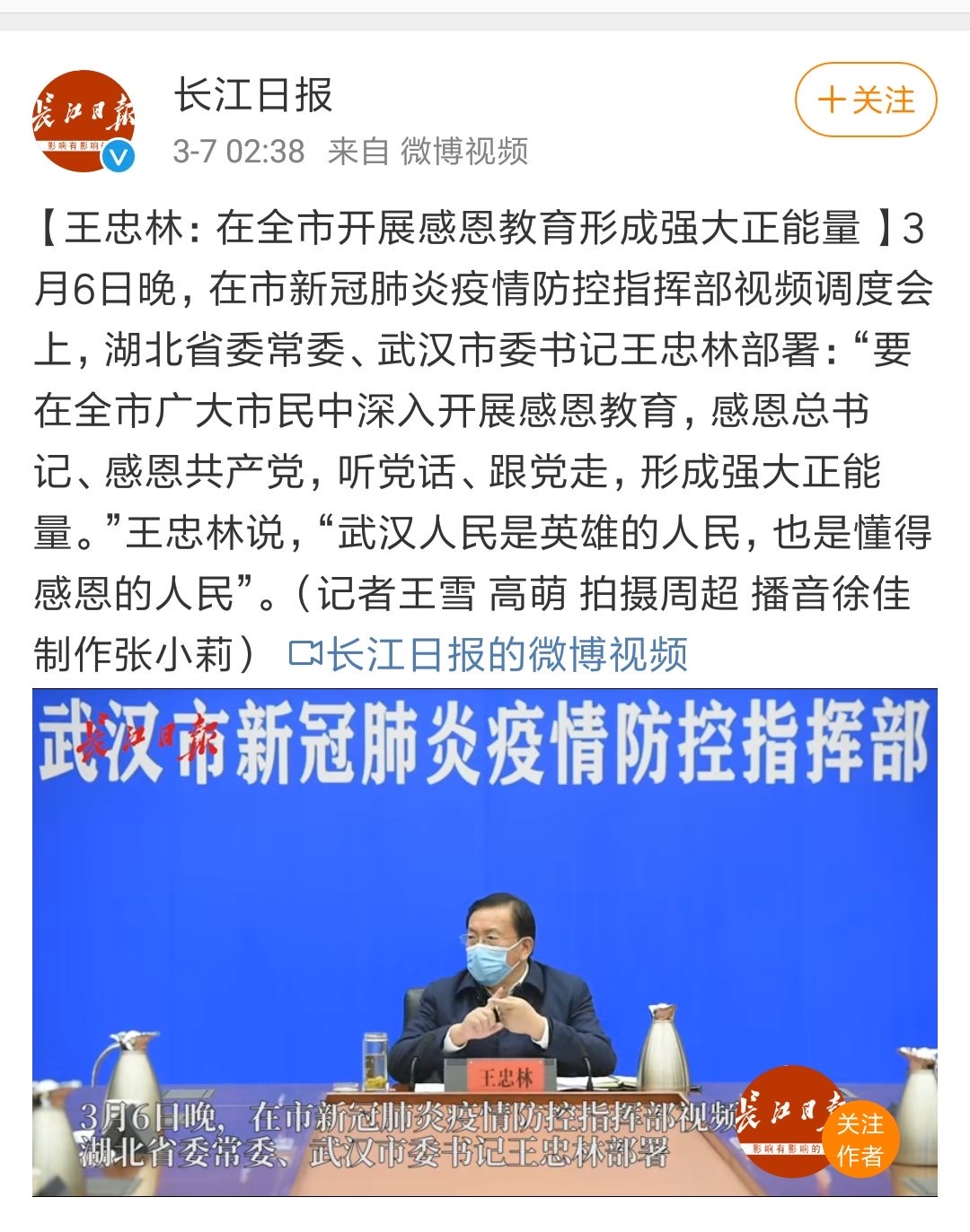 该报道根据《长江日报》消息,王忠林特别提到,干部要到群众中去,要宣传群众、发动群众、依靠群众,共同做好疫情防控工作,通过多种形式的宣传教育活动,在广大市民、党员干部中间开展感恩教育,“武汉人民是英雄的人民,也是懂得感恩的人民。”