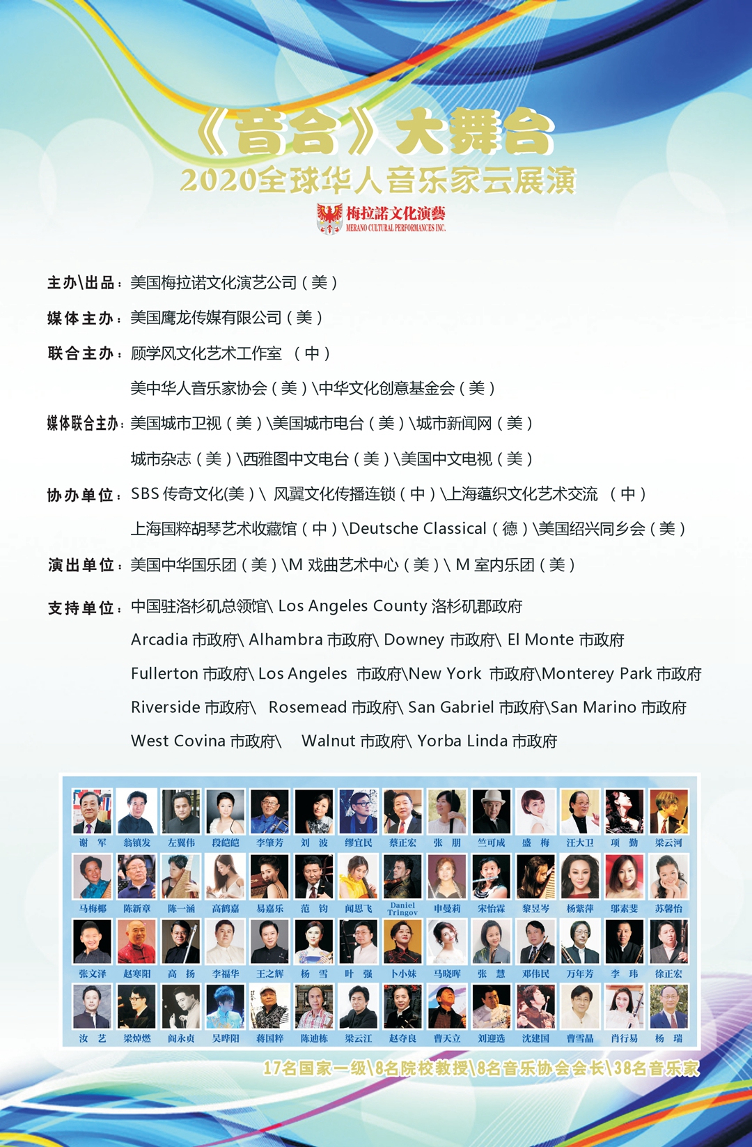 “文艺抗疫 音爱而暖”——全球华人音乐名家云展演活动,《音合》大舞台2020全球华人音乐家云展演于2020年5月23日圆满举行。本次云展演特邀17位国家一级演奏家、8位艺术院校教授、8位音乐家协会会长、38位音乐家参演。