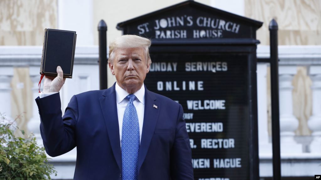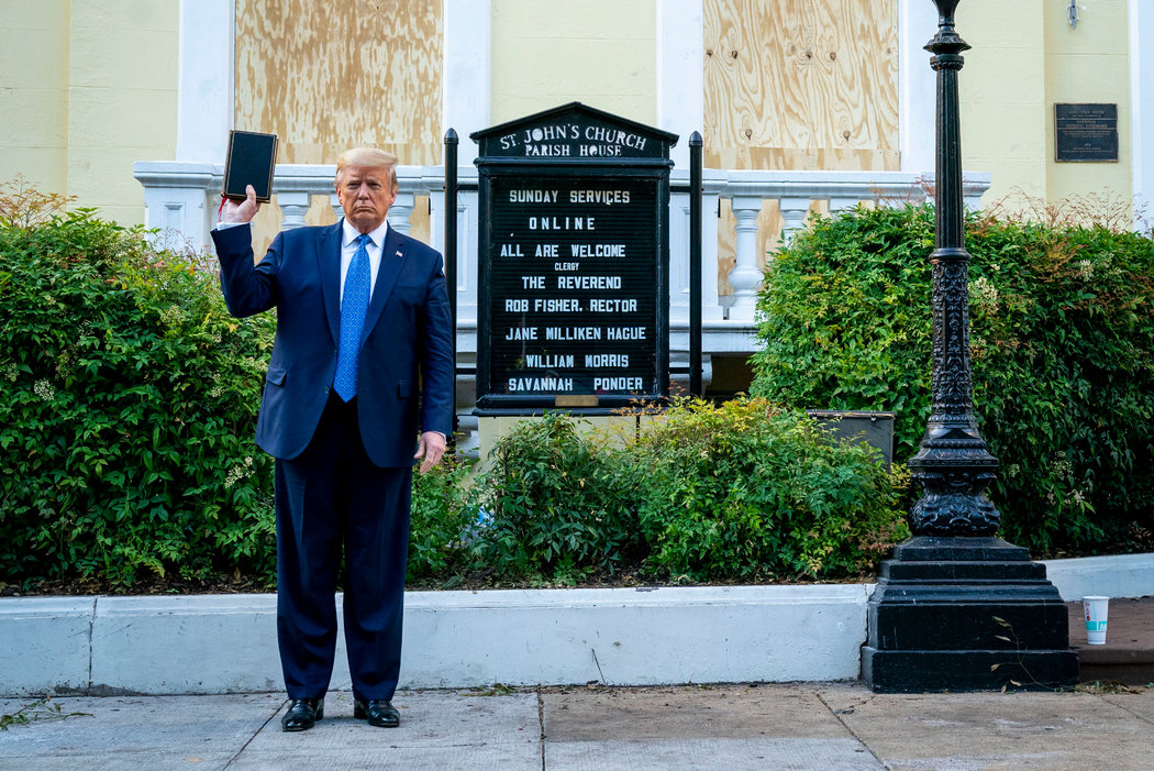 等到走到圣约翰教堂的时候,特朗普已经不再掩饰自己的摆拍意图——他举起由女儿携带的圣经,随后召集几位高级顾问,在他身边站成一排。他没有发表任何评论,而在达成目的之后,他返回白宫,途中经过一堵墙,上面的新涂鸦写着,“Fuck Trump”(特朗普滚蛋)。