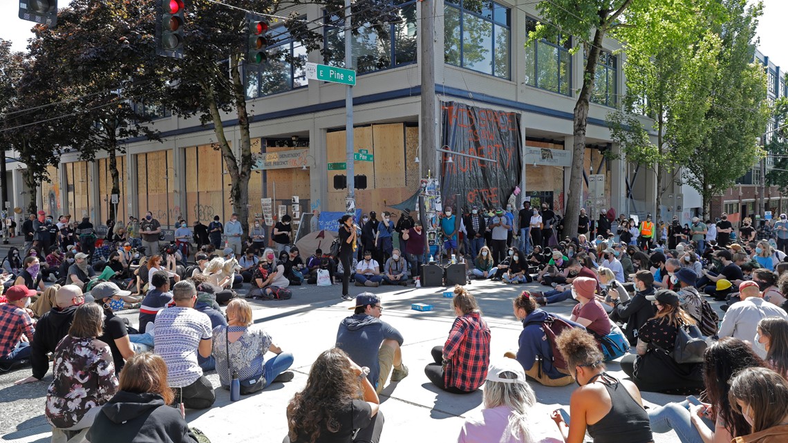 (抗议者坐在西雅图警察局东区大楼前听演讲,该大楼已被钉上木板,并且警察已经撤出,2020年6月11日(星期四)这里被称为“国会山自治区。经过数天与抗议者的暴力对抗后,西雅图的警察已从附近地区撤出。 美联社照片/特德·沃伦)