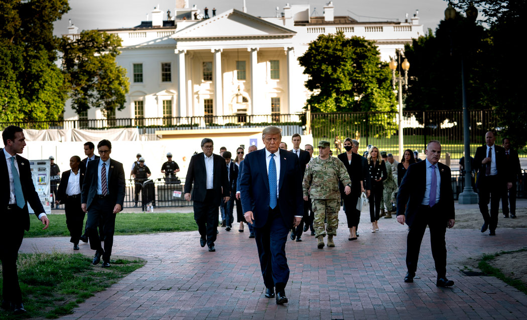 下午6点43分,特朗普在玫瑰园用7分钟发表了声明,然后穿过白宫,出现在白宫北侧,走出大门,进入公园。巴尔、埃斯珀、米莱、梅多斯、伊万卡、库什纳等人跟随着他,但彭斯和他的幕僚选择留在空荡荡的白宫里看电视。