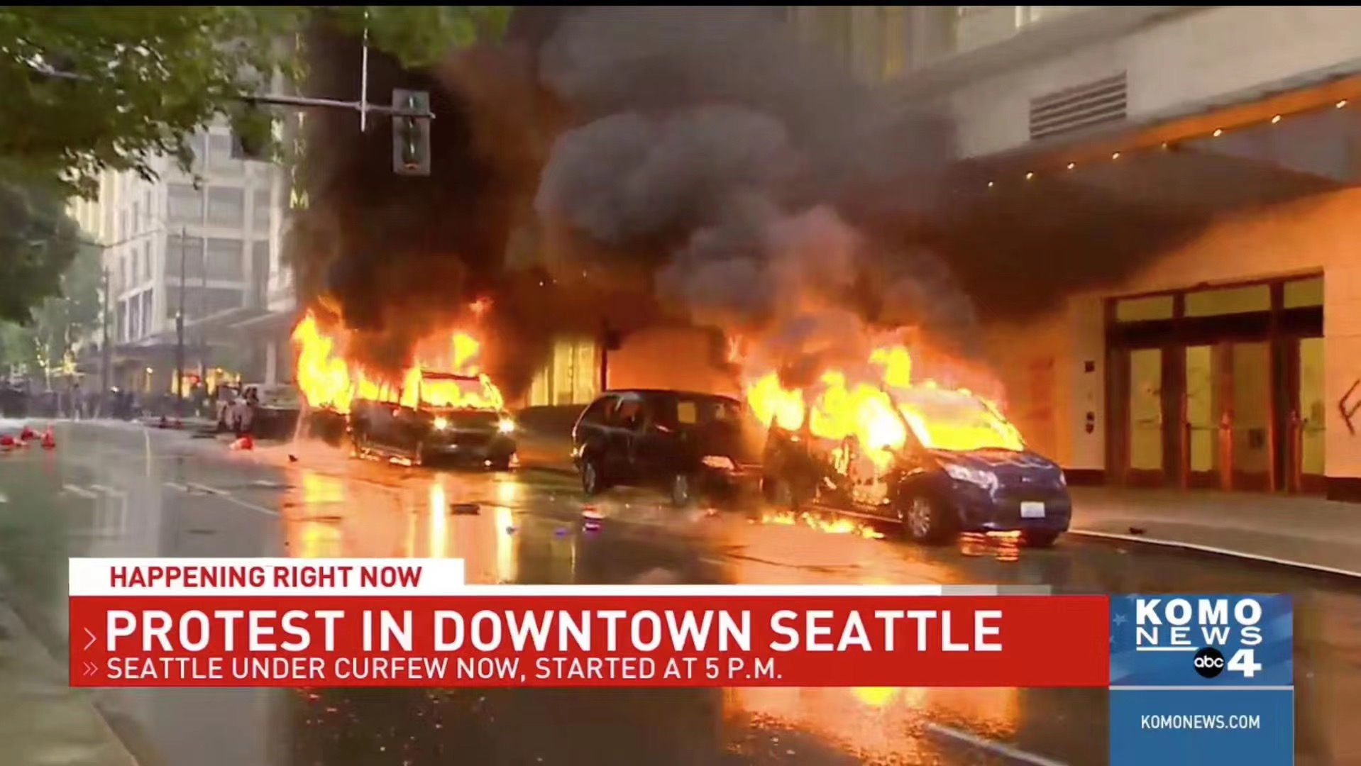 - 示威者放火烧了几辆西雅图警察局的车辆;