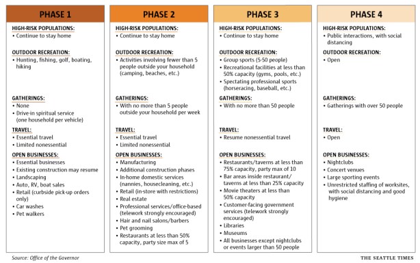 通过华盛顿州的“安全启动”计划,将逐步重启更多的业务和活动,并制定适当的安全和健康标准。每个阶段至少需要三个星期。
