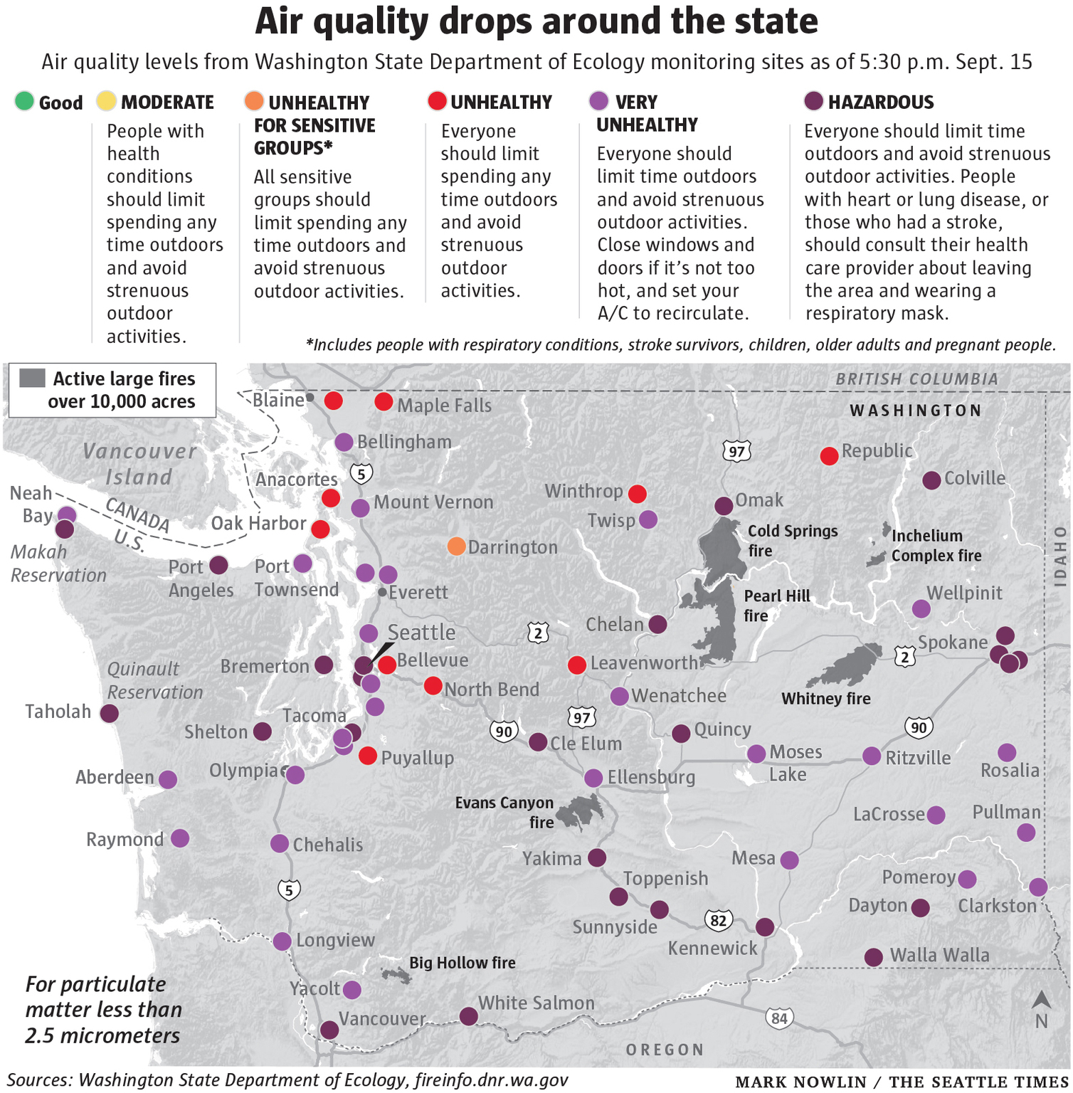 根据美国生态部的空气监测网络,到星期五晚上,西雅图和塔科马的空气质量被认为对敏感人群来说是“不健康的”,这比“不健康”和“非常不健康”的类别有所改善。