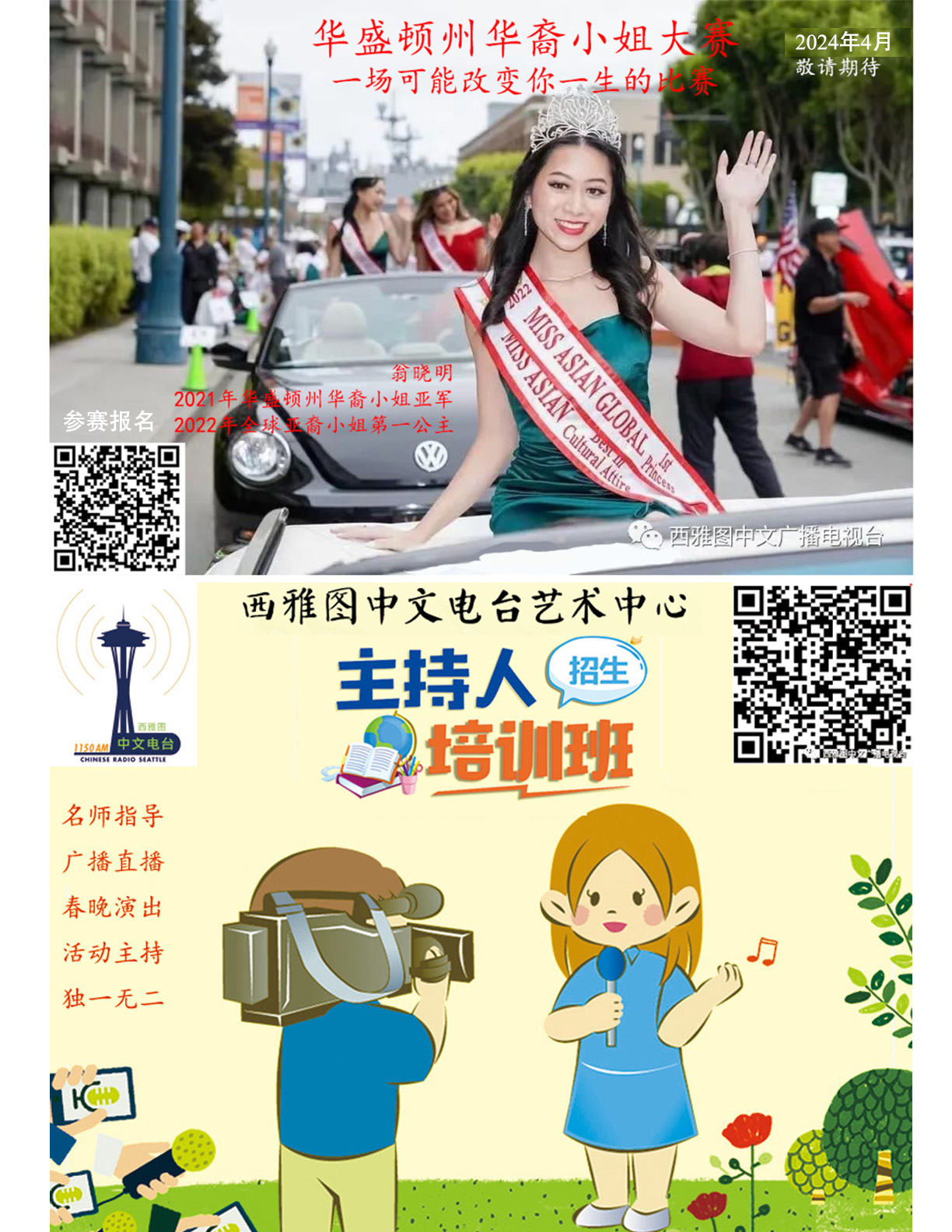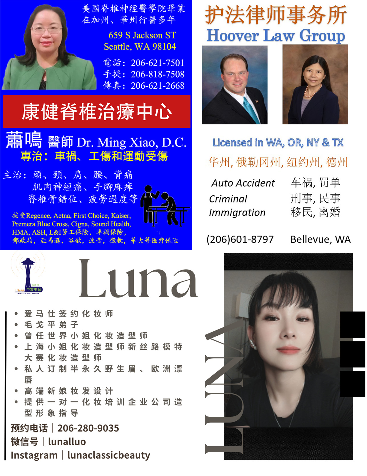 (大中华实业有限公司Hanson Chong抽奖,背景分别是《西雅图华人月刊》创刊号封面人物张斌、2023年7月期封面人物吴小燕)