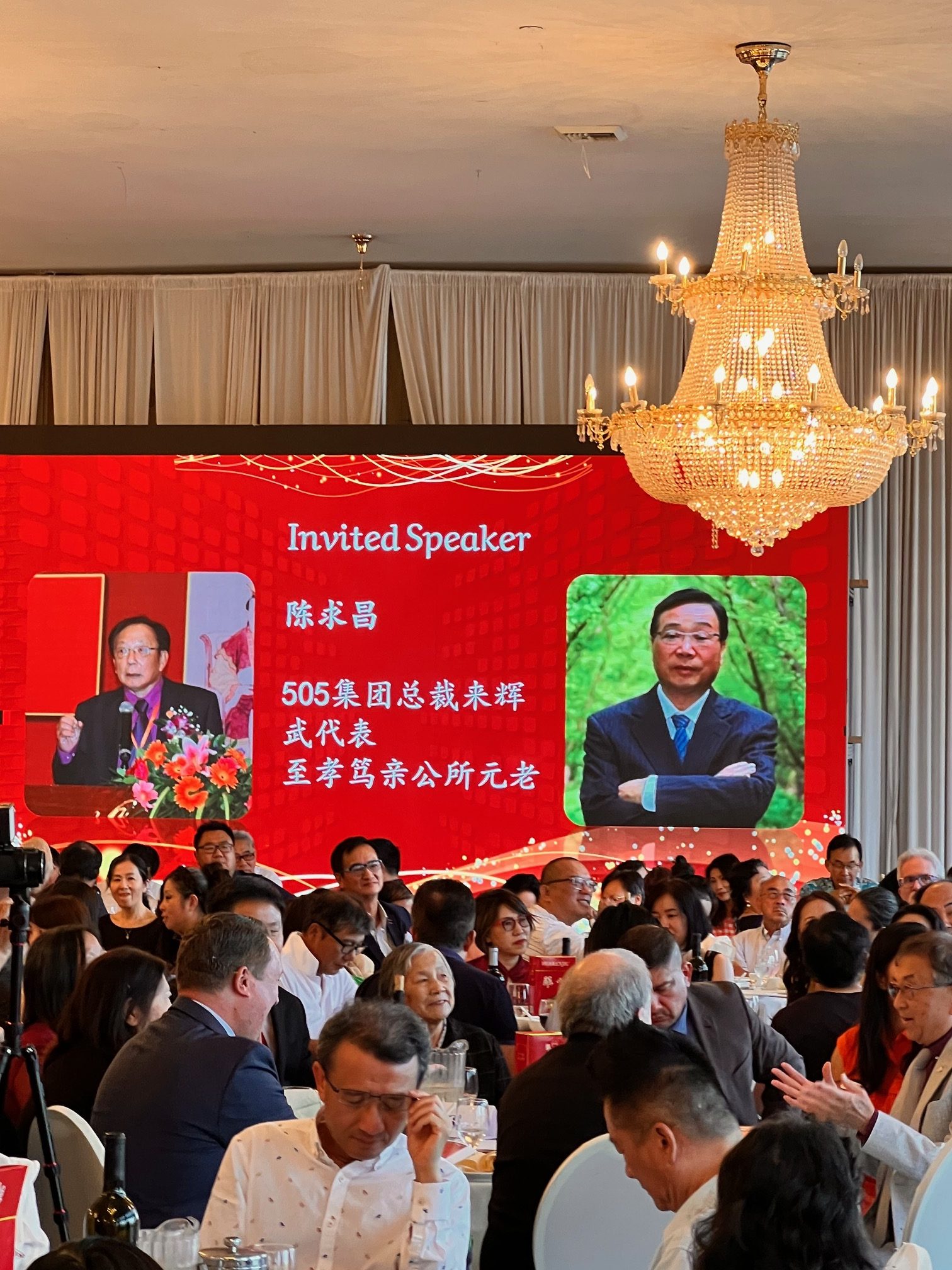 (505集团公司总裁来辉武的代表、西雅图至孝笃亲公所元老陈求昌发言)