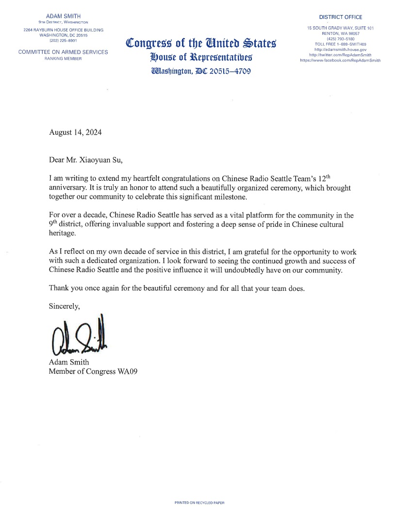 西雅图中文电台12周年台庆晚会于2024年8月17日星期六晚在西雅图中国海景大酒楼隆重举行。西雅图中文电台台长苏小元致欢迎词。到场发言的嘉宾有:美国国会议员亚当.史密斯Adam Smith、金县行政长官办公室代表James Bush、贝尔维尤市议员、前市长李瑞麟、505集团公司总裁来辉武的代表、西雅图至孝笃亲公所元老陈求昌,以及Bellevue市议员Janice Zahn (梁浩婷)、Bellevue市议员Jared Nieuwenhuis、Burian市议员Jimmy Matta、西雅图市议员Tanya Woo (胡清雅)、Edmonds市议员Weill Chen (陈伟)、曹霄鹤律师事务所所长曹霄鹤、华州广州广府会创会会长梁国尧、华盛顿州美中贸易促进会会长区伟明、西雅图杰人会会长左谷兰、西雅图高雄姐妹城市协会会长、吴氏产业集团公司董事长吴小燕、海景大酒楼业主王小玲、西雅图上海联谊会会长汪毓敏等。
