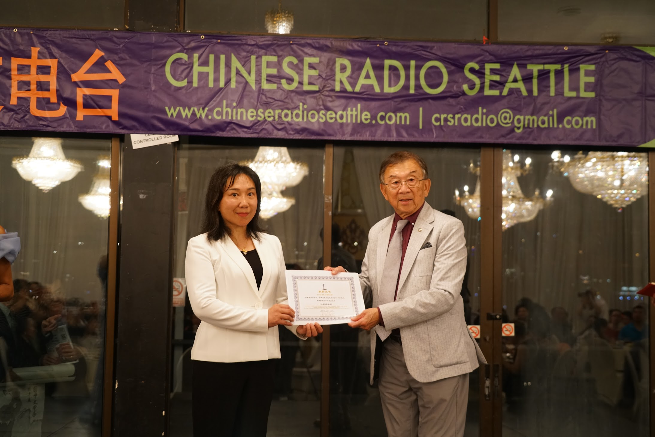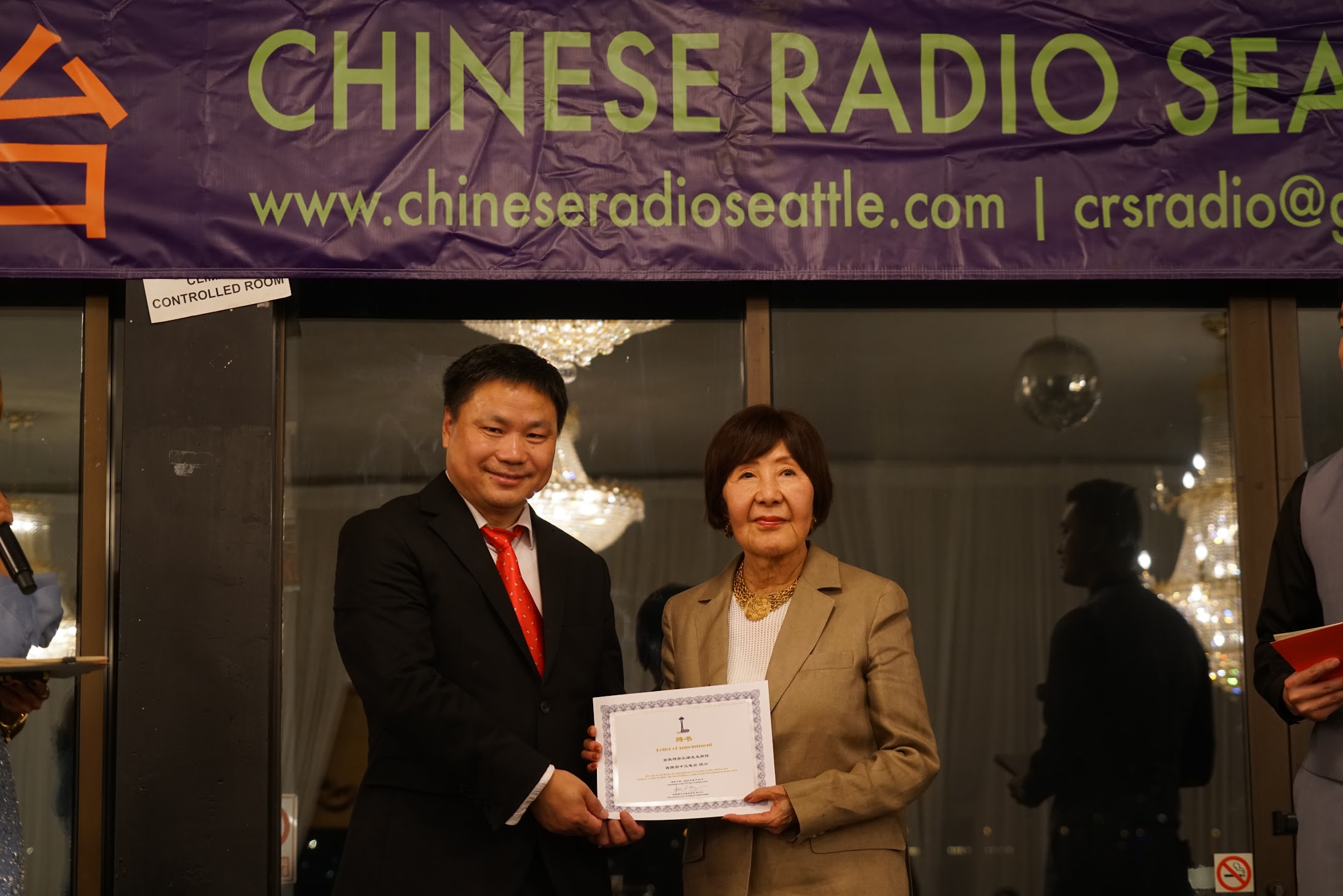 (西雅图中国海景大酒楼业主孙乐瑜受聘为西雅图中文电台顾问,王小玲代领聘书)