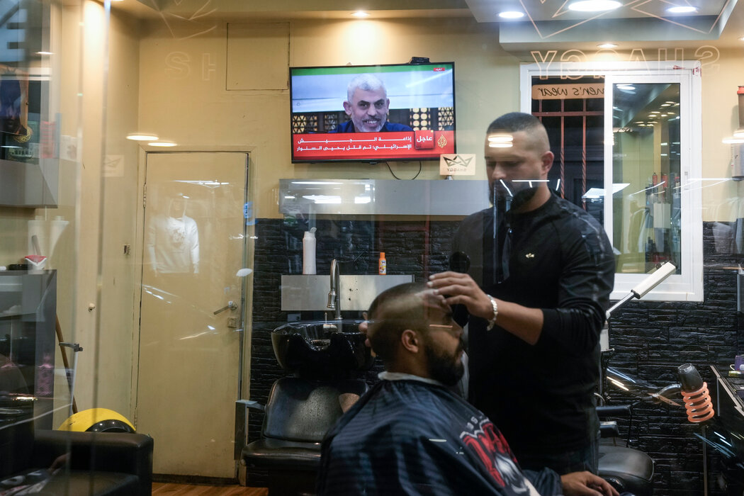 (周四,约旦河西岸城市伯利恒一家理发店电视上的辛瓦尔画面。 Mahmoud Illean/Associated Press)