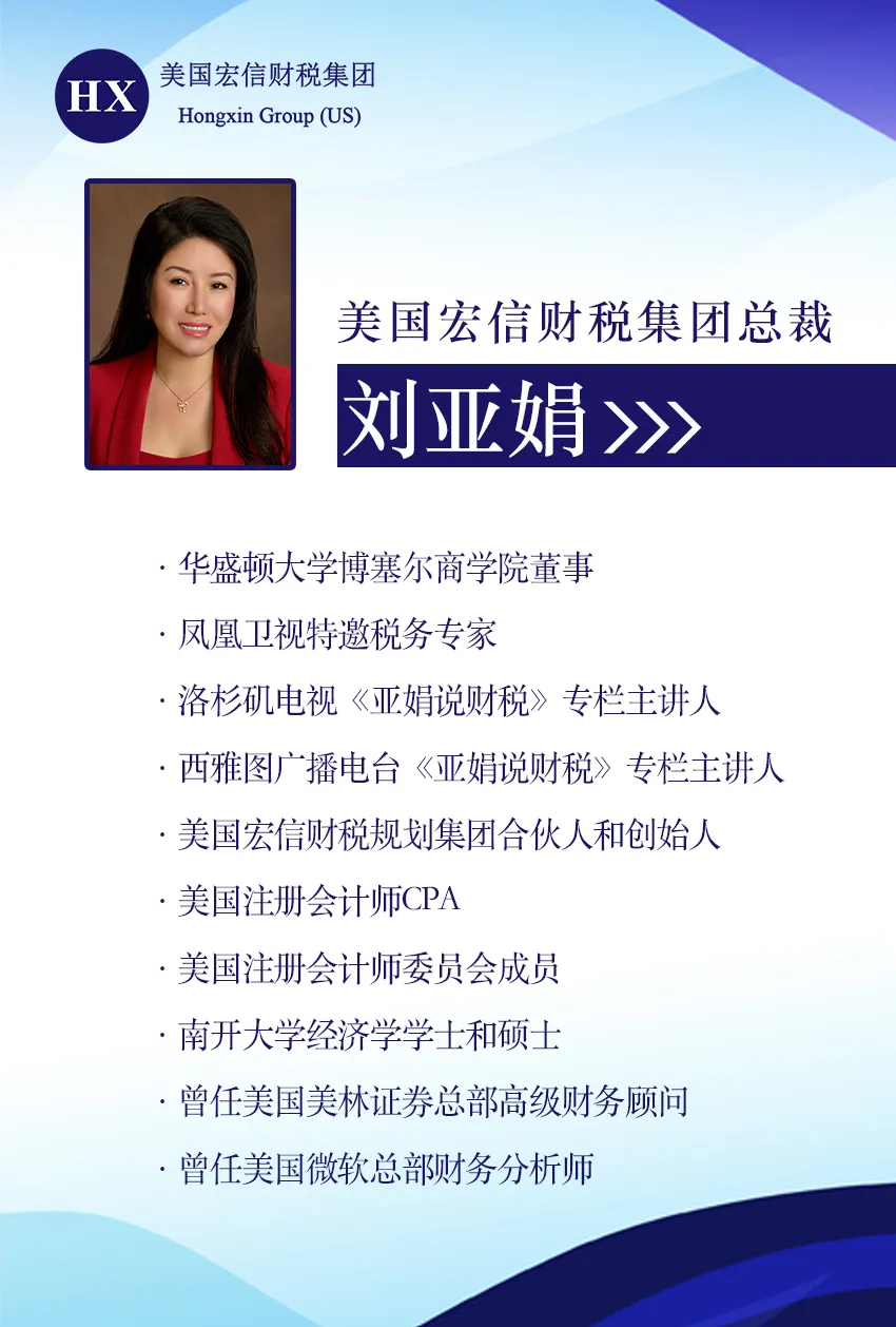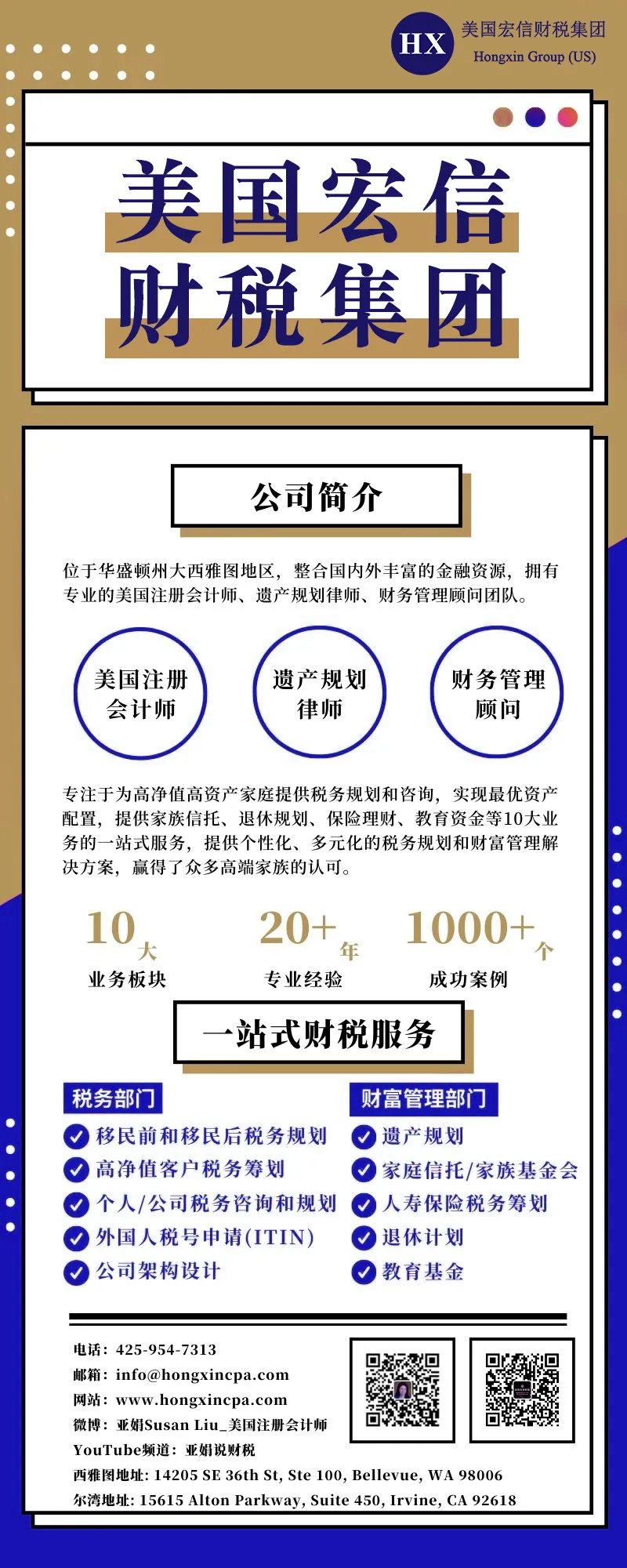 美国宏信财税集团由专业的美国注册会计师,财富规划师和信托律师组成。如果您有任何关于税务的问题,请随时联系我们,我们将给您最专业的建议和规划!