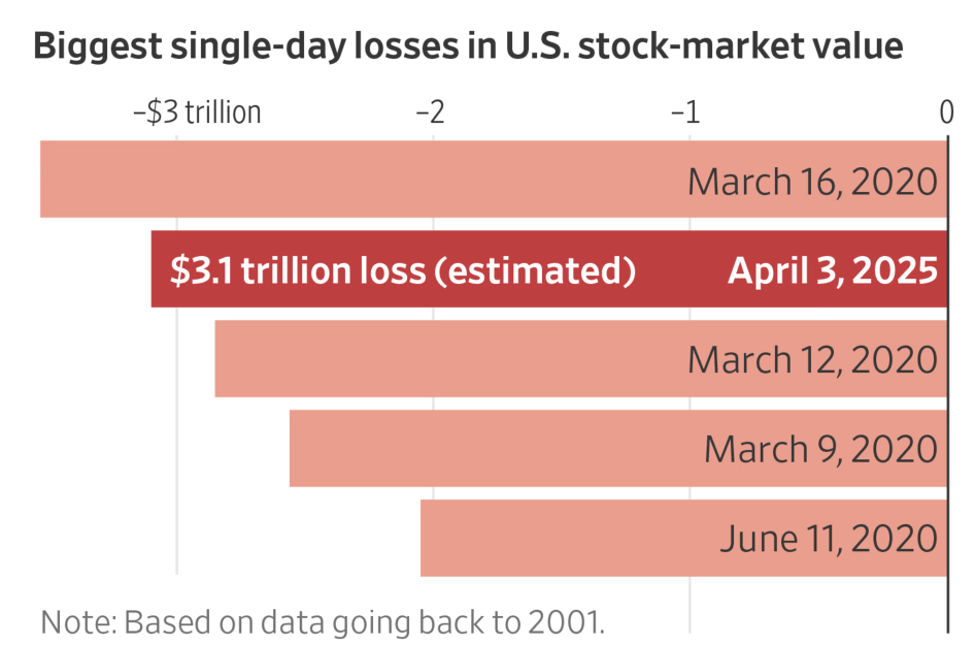 - 美国:4月3日,美股全线大跌,道琼斯工业平均指数下跌1,679点(4%),纳斯达克指数下跌6%,标准普尔500指数下跌8%,市值损失约3.1万亿美元,位列2001年以来单日市值蒸发第二位。