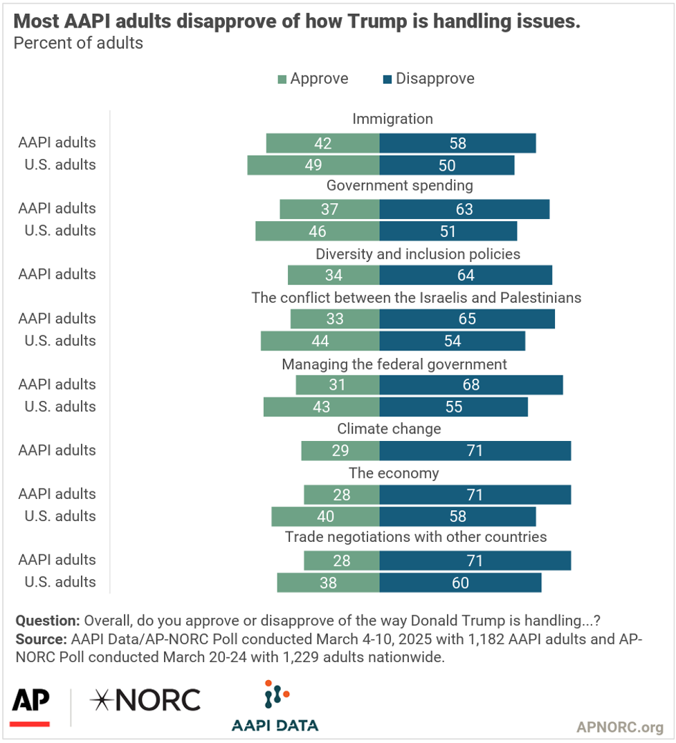 本周三,专注于美国亚太裔社区研究的非营利组织亚太裔数据(AAPI Data)和 AP-NORC 公布了一项调查结果,该调查主要关注亚太裔社区对特朗普总统议程的反应。