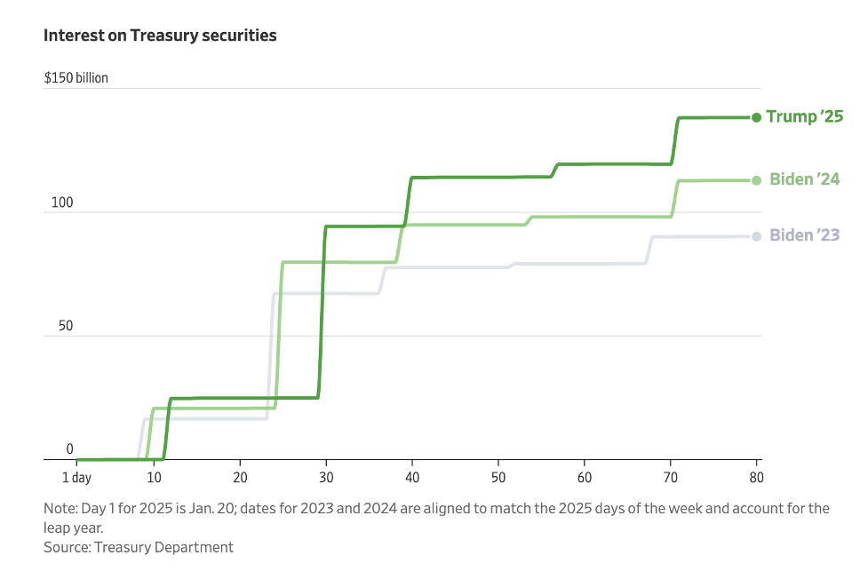 自特朗普回到白宫以来,美国已支付了比2024年同期多出255亿美元的债务利息。利率上升和国家债务增加是推动这一成本上升的主要因素。