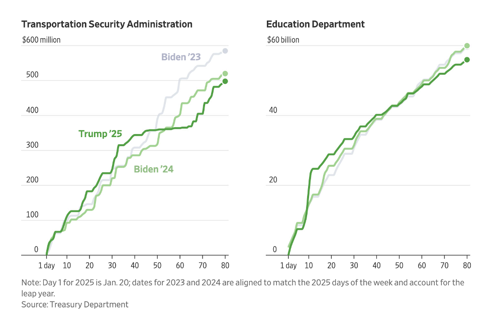 《华尔街日报》近日对财政部发布的日常财务报告进行了分析,发现自特朗普就职以来,尽管其专门为马斯克量身定制了一个以削减联邦支出为目标的政府效率部(DOGE),但其政府的总支出却比2024年同一时期的拜登政府增加了1540亿美元。