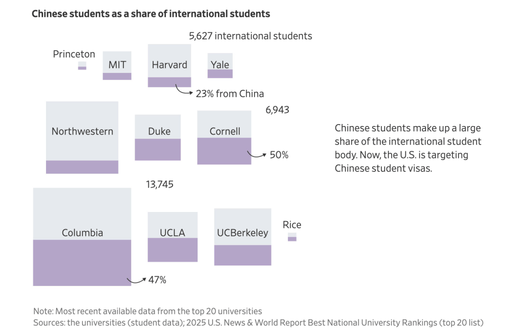 在特朗普政府宣布将积极吊销中国学生签证后,《华尔街日报》特别发布了这篇报道,用详细的数据和图表展示了目前中国留学生在美国主要大学的分布和占比,并从财务、学术影响等角度,分析了该政策可能造成的伤害。以下内容为根据该报道翻译整理: