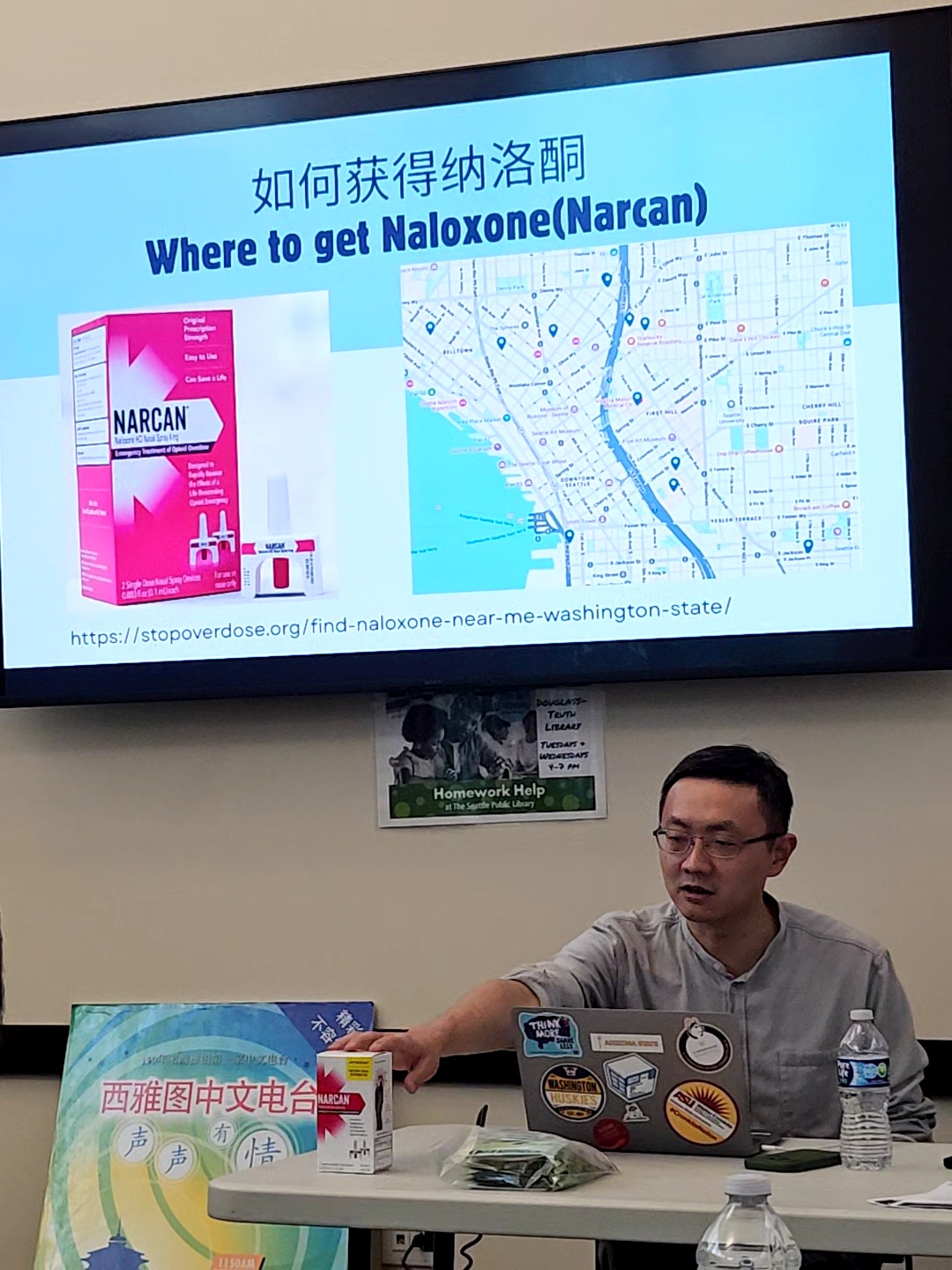 【西雅图中文电台报道,记者Chentao、Amber】5月17日,西雅图中文电台在西雅图公立图书馆Douglass-Truth 分馆,举行了中英双语的药物过量预防与康复讲座,这也是电台与华盛顿州卫生部合作,为本地华人社区带来的首个该领域线下活动,吸引了部分社区成员的参与。此次活动还得到了美国疾控中心CDC药物过量数据与行动项目(Overdose Date to Action Program, OD2A)以及金县公共卫生部的支持。