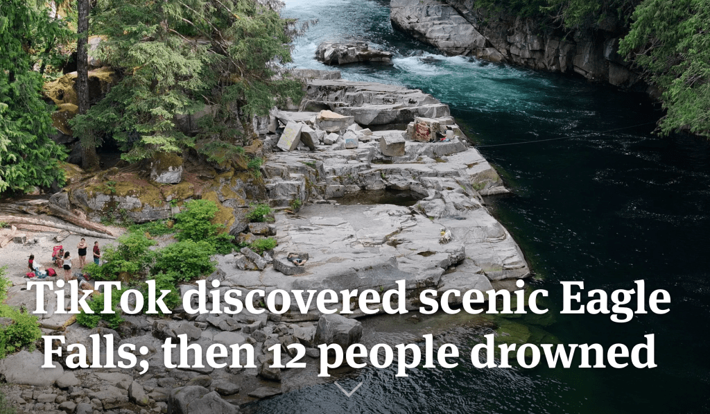 在社交媒体TikTok的带动下,位于华盛顿州Skykomish River沿线的鹰瀑(Eagle Falls)成为户外爱好者争相打卡的热门景点。然而,这片风景如画的瀑布背后却藏着致命危险:过去五年中,已有12人在此溺水身亡。