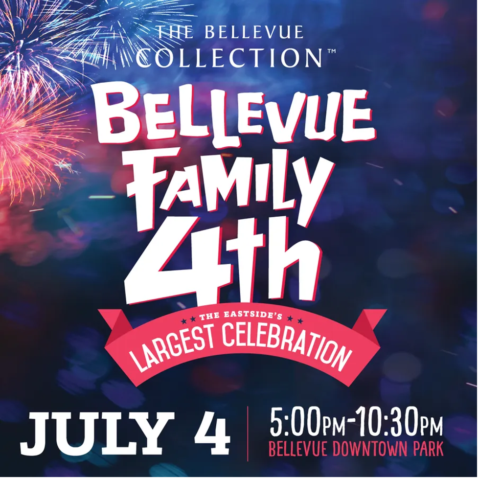 亮点:Bellevue Downtown Park 联合举办家庭日活动,包括儿童游乐、户外音乐、食品市集,夜间由 Bellevue Symphony Orchestra 伴奏下观赏烟花,氛围温馨适合亲子共赏。
