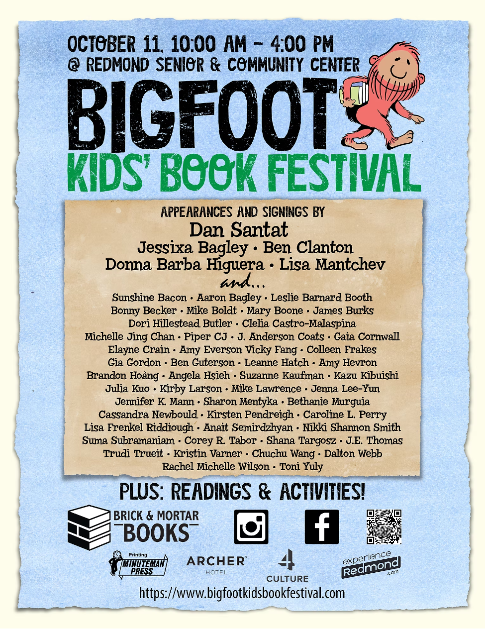 亮点:大脚怪儿童图书节是华盛顿州雷德蒙德市一年一度的盛会,汇聚了儿童及青少年文学作家与插画家,通过签售会、专题讨论和互动活动与读者建立联系。该免费全龄节在雷德蒙德长者社区中心举办,旨在通过让孩子们接触丰富多元的文学作品及其创作者,培养阅读兴趣。