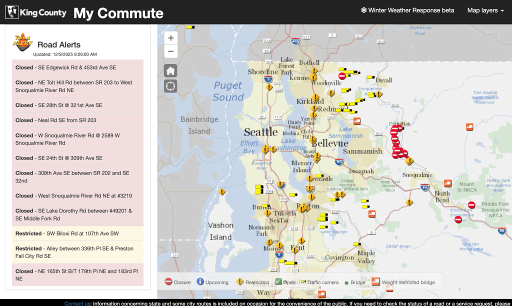 ● Highway 202 与 203 多段被水淹没,从 Fall City 到 Carnation 一带完全封闭,预计暂无重开时间。