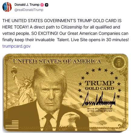 在美国总统特朗普本周宣布正式开放“金卡”(Gold Card)签证申请后,这一以 100 万美元“财务贡献”换取美国永久居留权的计划,迅速成为全球舆论焦点。尽管官方网站宣称获批者将能在“创纪录的时间内”获得美国身份,但从公开信息及多名移民律师的判断来看,对于包括中国公民在内的部分国家申请者,流程与周期可能远比宣传中复杂。