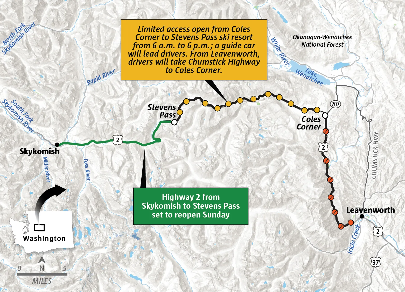 在公路东端,华州交通厅(WSDOT)已先行“试运行式”放行:引导车(pilot car)每天早6点至晚6点带队通过一段约8英里的施工区,车辆单向交替通行,延误可能长达一小时;晚6点后,史蒂文斯山口以东会再次全线封闭。与此同时,莱文沃斯到科尔斯角(Coles Corner)的图姆沃特峡谷(Tumwater Canyon)仍继续关闭,泥石流与河水冲刷导致路基受损,整条公路完全恢复可能还需数月。