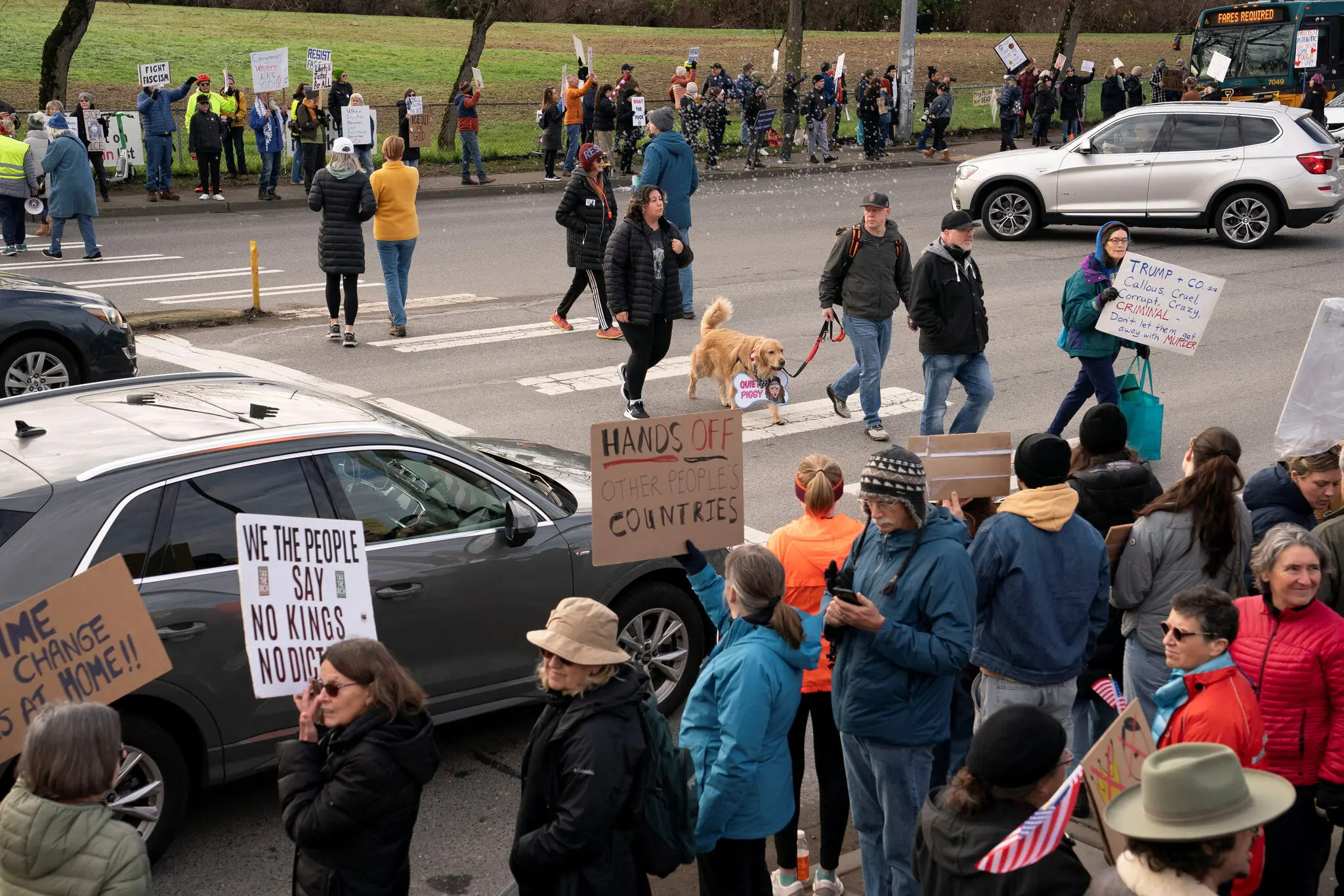 在西雅图,抗议者沿街站立,举着反对特朗普政府与移民执法升级的标语,车辆经过时不时鸣笛回应。
