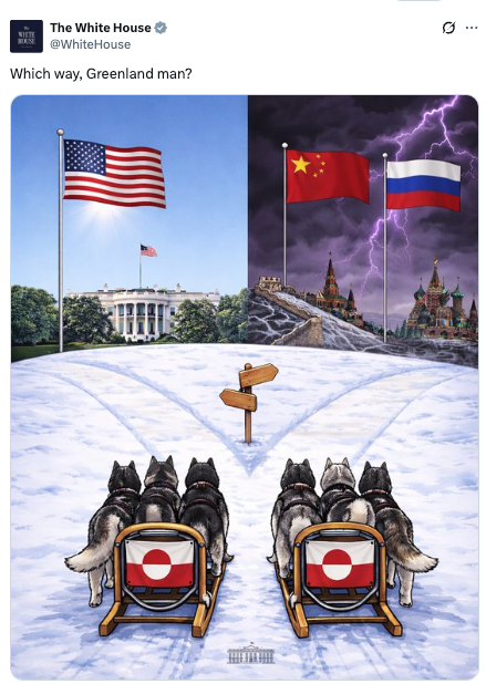 会谈结束后不久,特朗普在椭圆形办公室对记者再次强调美国“需要格陵兰”,并称丹麦“无法阻止”俄罗斯或中国“占领格陵兰”,而美国“能做到一切”。他还把这一逻辑与近期美国对委内瑞拉的行动相类比,声称“你们上周在委内瑞拉已经看到了”。更早些时候,他在社交媒体发文称:如果格陵兰落入除美国以外任何国家之手都“不可接受”,并宣称北约应当“带头”推动美国得到格陵兰,理由之一是这对他提出的“金穹”(Golden Dome)导弹防御计划“至关重要”。白宫的X账号还发布了下面这张图,暗示格陵兰只有两条路线可以选择。