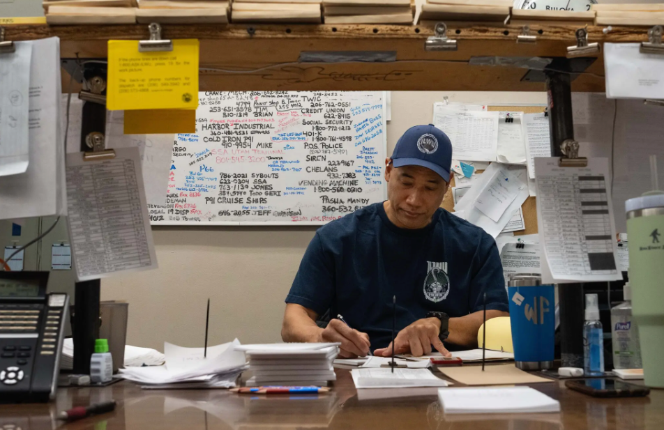 埃施自己也不是“码头世家”。她从科罗拉多来到华盛顿州,在塔科马的普吉特湾大学(University of Puget Sound)学戏剧,后来在一家码头工人常去的酒吧打工,被客人劝去码头试试。她爱上了那种“油腻、脏、流汗”的工作,也爱上了在海边、在西雅图天际线下干活的同伴情谊——哪怕最初那些年并不好过:她靠工会前辈提供的免费住处才撑住,又做过第二份工作,才熬到今天当上派工员。她曾把这份工作当作“稳定人生”的出口:薪水、福利、养老金,一旦熬上去,“很难找到同等安全感的职业”。但现在,她越来越不敢把这条路推荐给下一代。